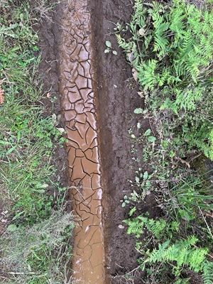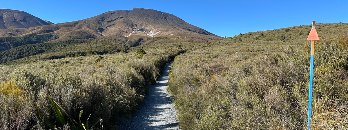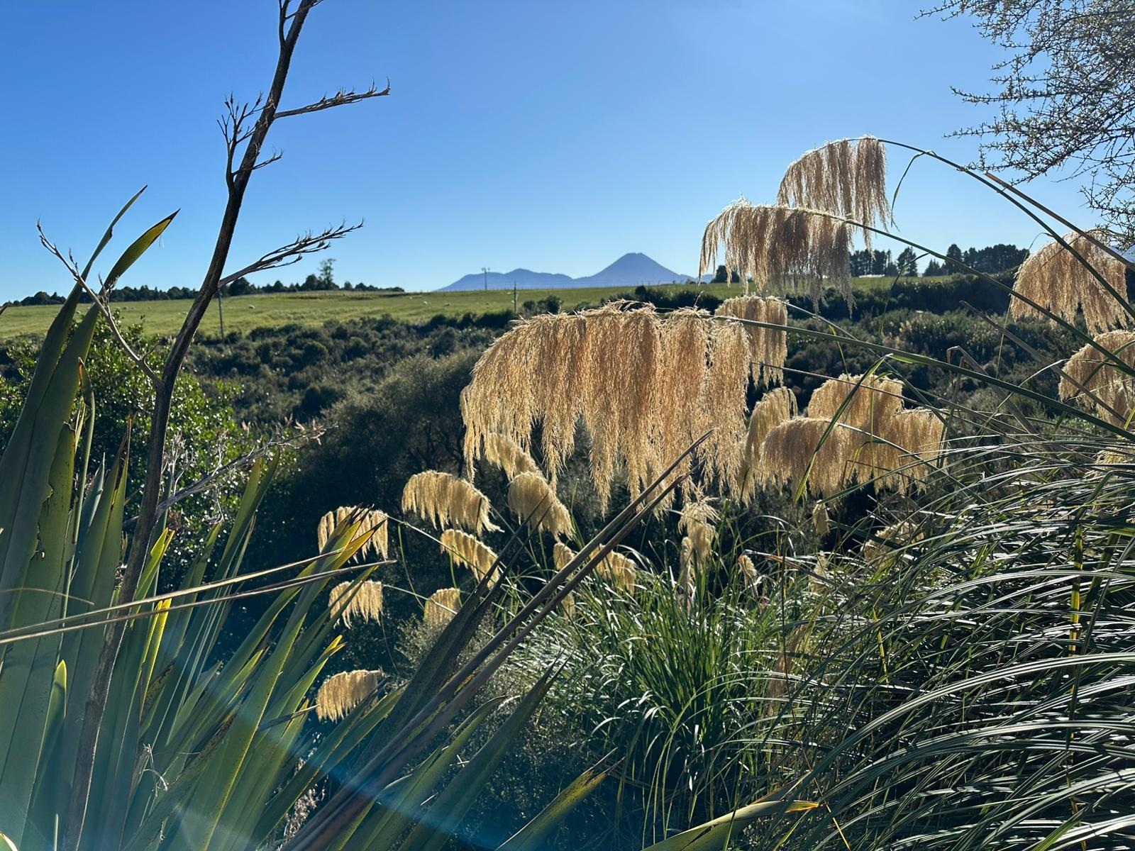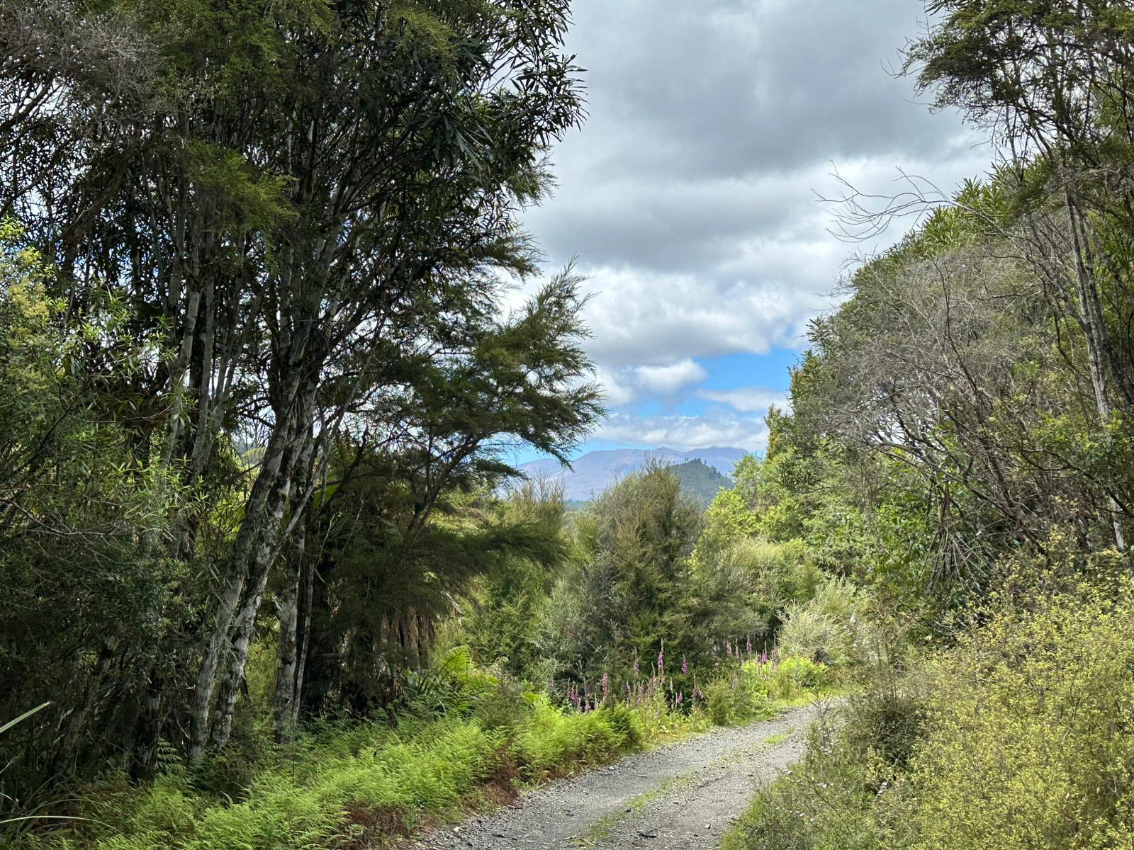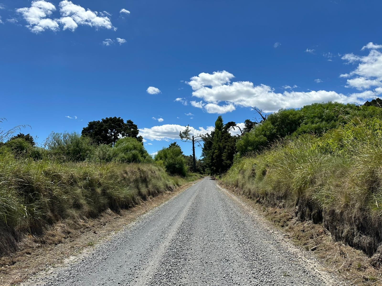 In aller Ruhe duschte ich, frühstückte und packte zusammen, bevor ich mich auf den Weg machte. Der Tag versprach, nicht sonderlich anstrengend zu werden, da es, abgesehen von einer winzigen anfänglichen Steigung, überwiegend bergab gehen sollte. Der Himmel war strahlend blau, und ich konnte noch einmal die großartige Aussicht auf die Vulkane genießen, bevor ich Waimarino hinter mir ließ. Der Weg führte mich dann auf einen Schotterweg, wo die Aussicht leider etwas spärlicher wurde.