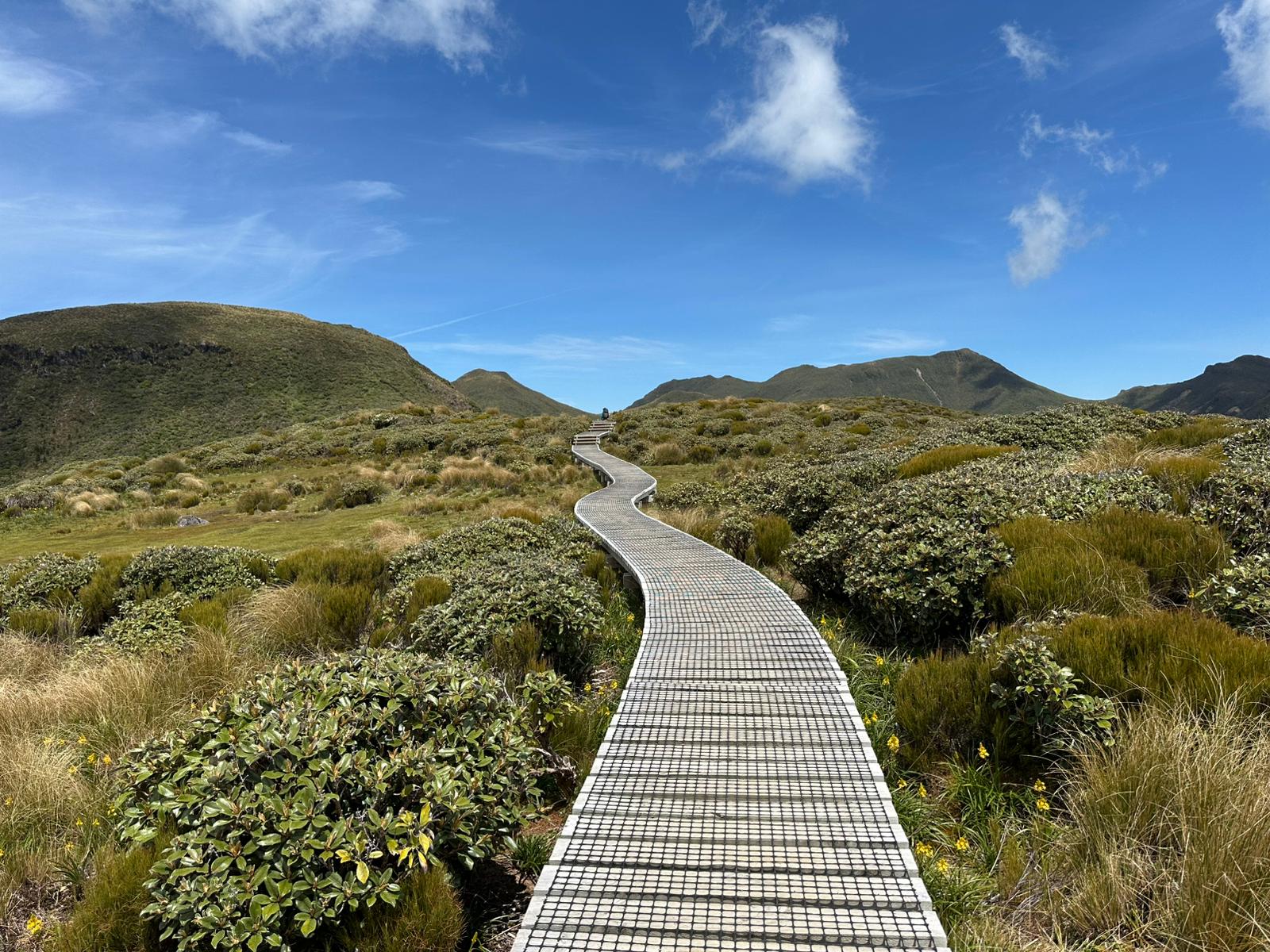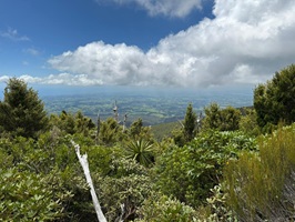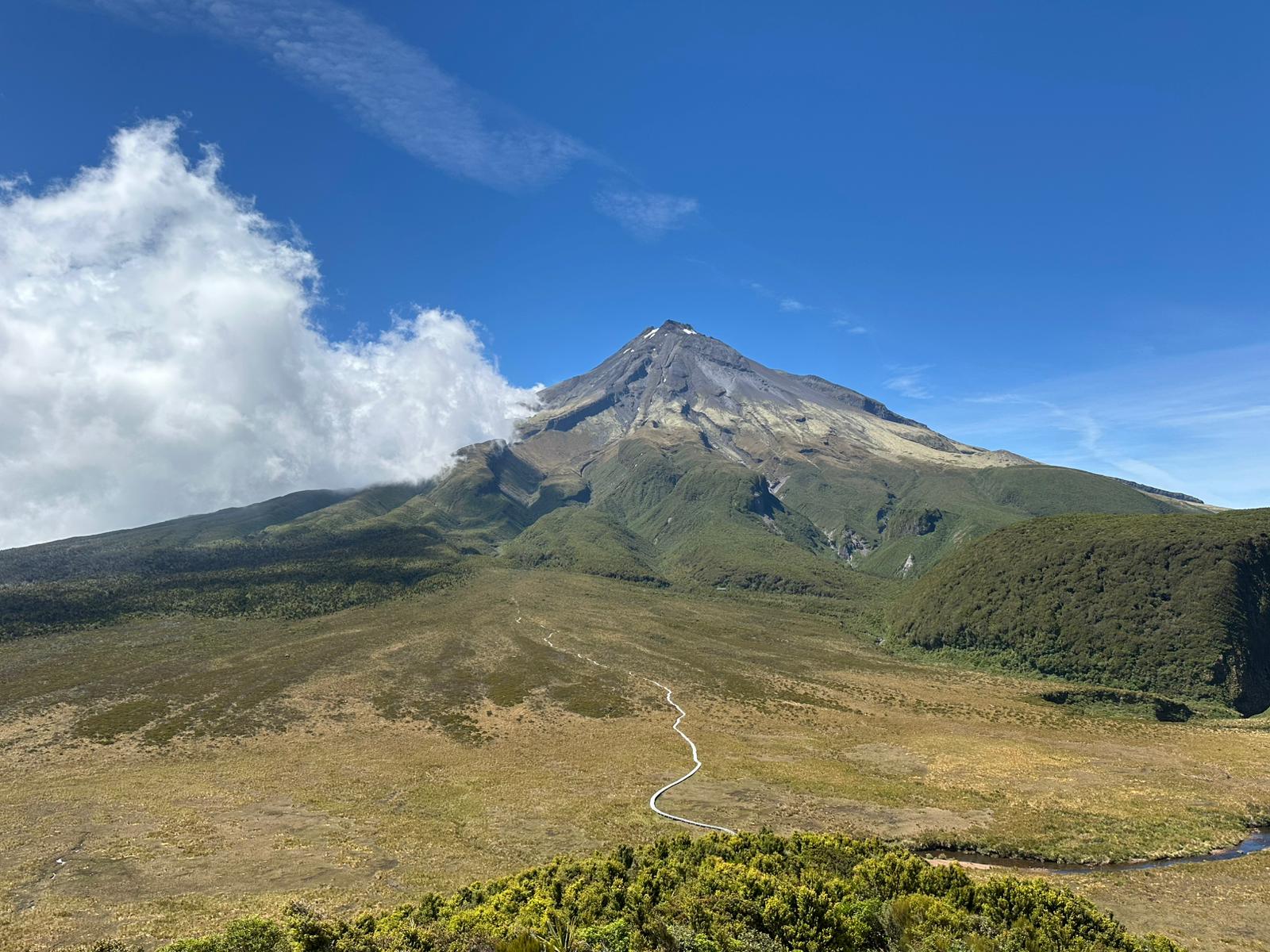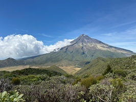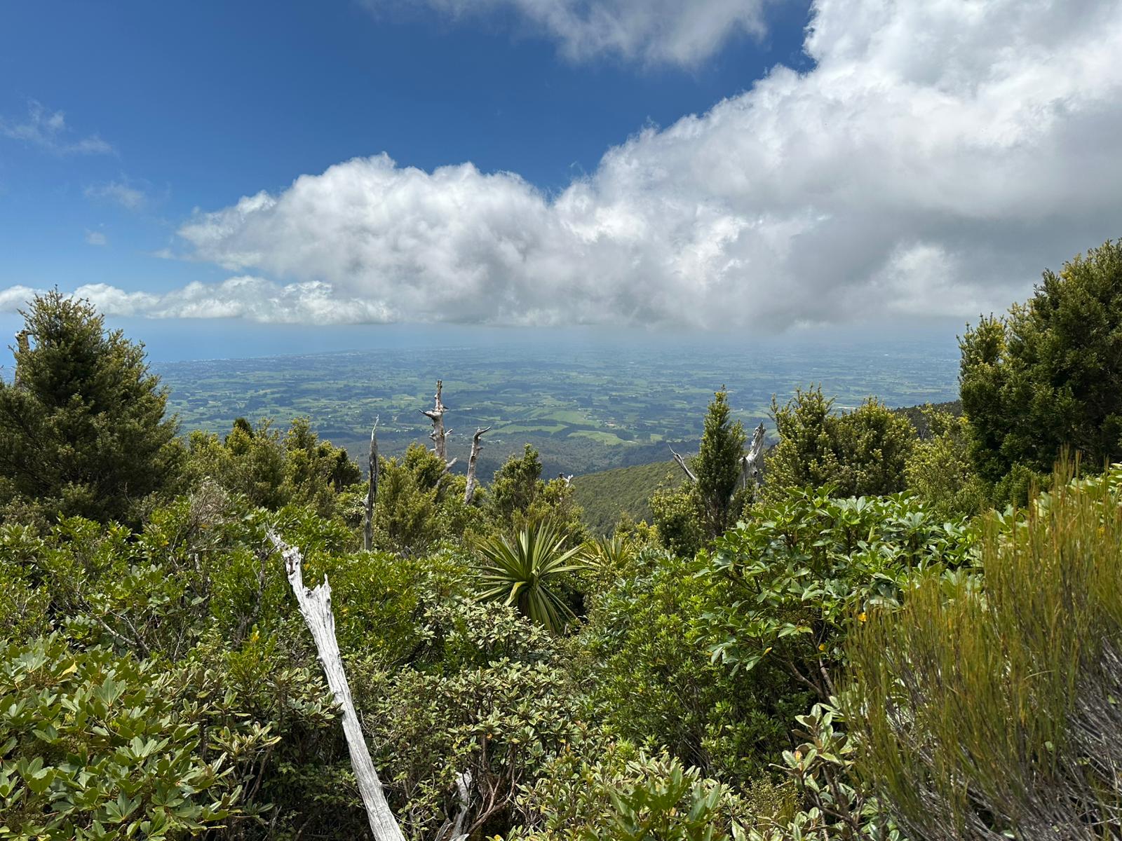 Als wir den Wald hinter uns ließen, eröffneten sich weite Ausblicke auf die Küste, die umliegenden Berge, die flache Ebene um den Vulkanberg herum und natürlich auf den Mt. Taranaki selbst. Zu Beginn unserer Wanderung strahlte der Himmel noch blau, doch im Laufe des Vormittags schoben sich weiße Wolken vor den markanten Berg. Es war eine tolle Wanderung in wirklich passender Begleitung. Der Weg war gut ausgebaut, immer wieder gab es Stufen und nur ganz selten mussten wir über Wurzeln oder Felsen steigen. Im Rückblickkonnten wir den bereits zurückgelegten Weg, wie er sich am Berg entlang zog und den Holzbohlenweg gut sehen.