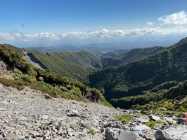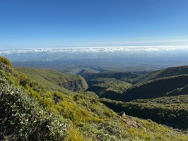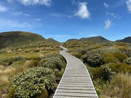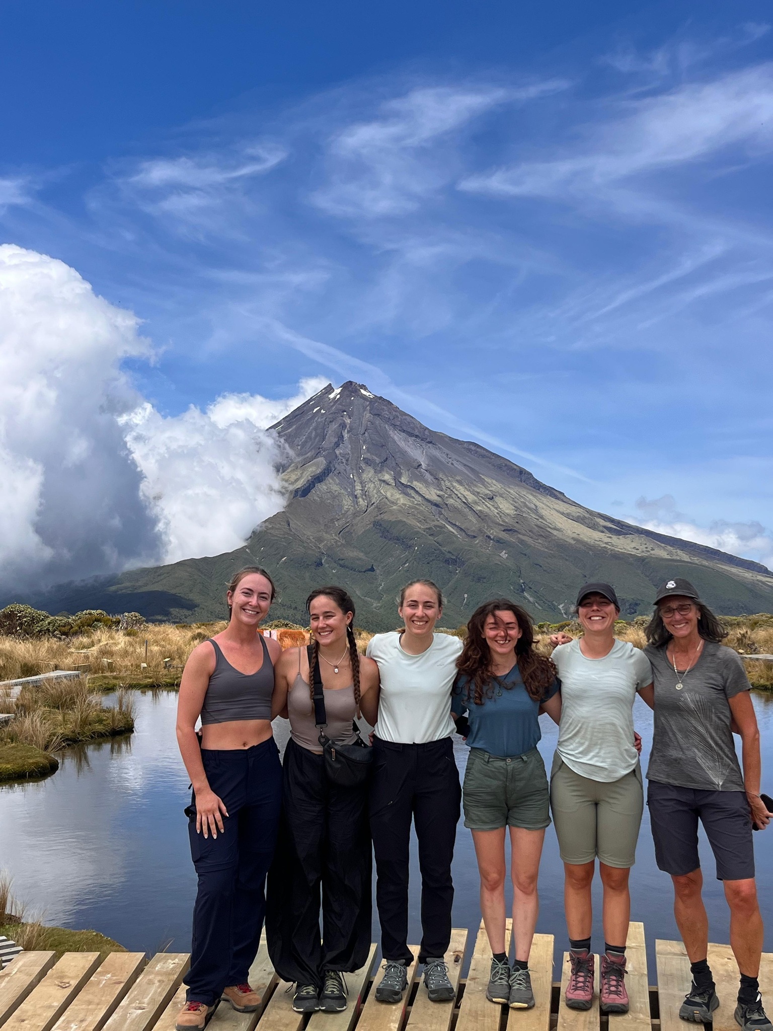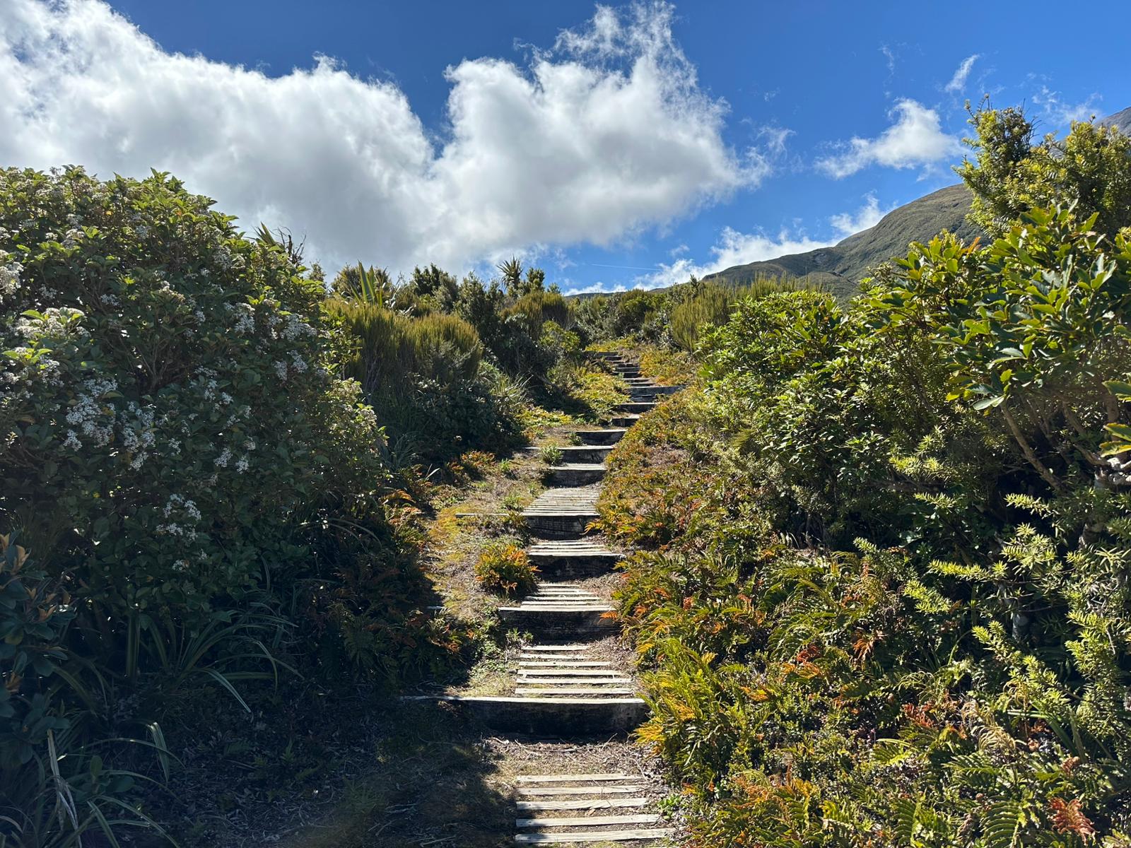 Als wir den Wald hinter uns ließen, eröffneten sich weite Ausblicke auf die Küste, die umliegenden Berge, die flache Ebene um den Vulkanberg herum und natürlich auf den Mt. Taranaki selbst. Zu Beginn unserer Wanderung strahlte der Himmel noch blau, doch im Laufe des Vormittags schoben sich weiße Wolken vor den markanten Berg. Es war eine tolle Wanderung in wirklich passender Begleitung. Der Weg war gut ausgebaut, immer wieder gab es Stufen und nur ganz selten mussten wir über Wurzeln oder Felsen steigen. Im Rückblickkonnten wir den bereits zurückgelegten Weg, wie er sich am Berg entlang zog und den Holzbohlenweg gut sehen.