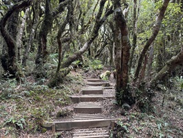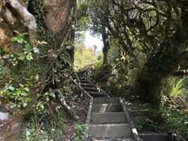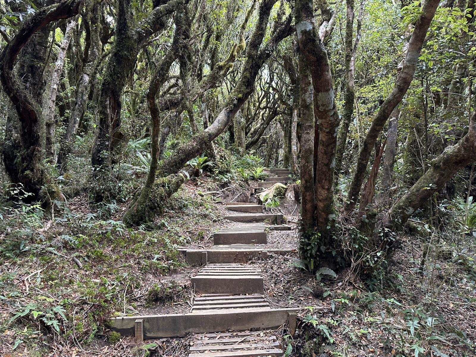 Wir legten eine lange Pause ein, bevor wir uns auf den Rückweg machten. Brad vom Hostel wollte uns um 15:30 Uhr abholen, und wir hatten die Option, anzurufen, falls wir früher unten wären. Aufgrund unserer ausgiebigen Rast war aber klar, dass wir ziemlich pünktlich ankommen würden. Der Abstieg durch den Wald führte wieder über unzählige Stufen, gefühlt sogar mehr als beim Aufstieg. Er bot keine Ausblicke mehr und so war ich froh, dass wir die Wanderung in dieser Richtung gemacht hatten, denn dieser Abschnitt war doch etwas langweilig.