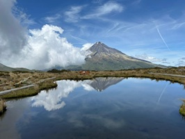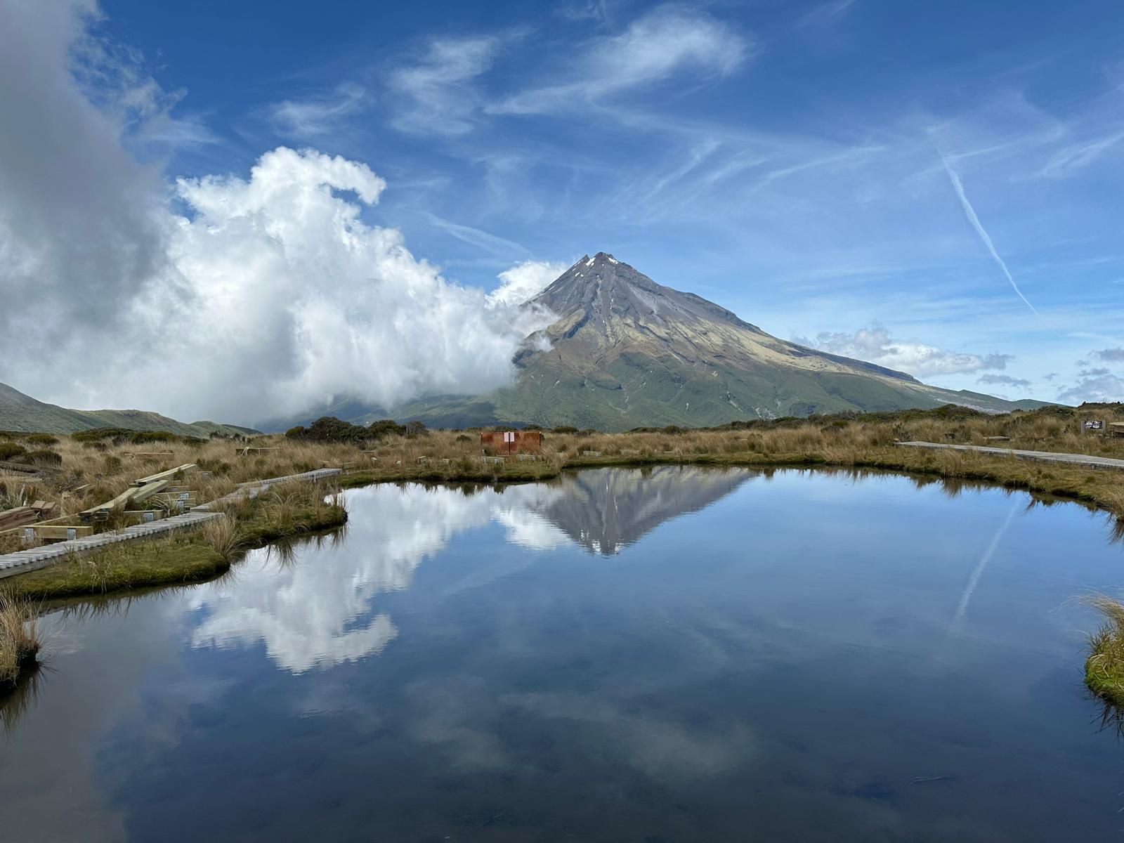 Das absolute Highlight für uns war der See, in dem sich der Berg spiegeln sollte, wenn es windstill ist. Ich hatte mit viel mehr Menschen gerechnet, doch bis dahin hatten wir so gut wie niemanden getroffen, was großartig war. Es war überhaupt kein Vergleich zum Tongariro National Park, wo sich die Menschenmassen durch den Park schoben. Die Spannung auf die Spiegelung wuchs, als wir dem See näherkamen. Wer einen großen Bergsee erwartete, kannte die Vokabel „tarn“ nicht – es handelte sich eher um einen kleinen Tümpel. Groß war er wirklich nicht, aber er erfüllte seinen Zweck und spiegelte den Taranaki. Da es nicht ganz windstill war, war es etwas knifflig, den richtigen Moment für ein Foto zu erwischen.