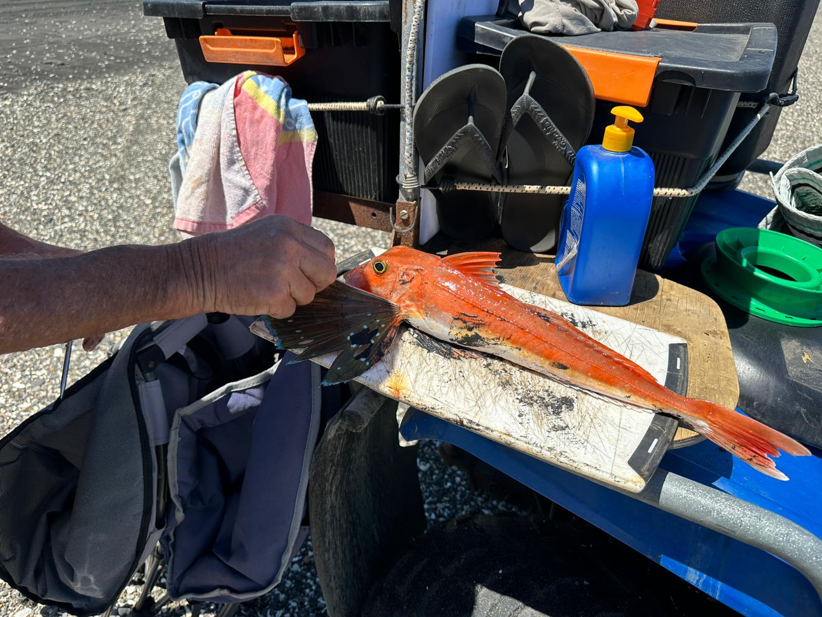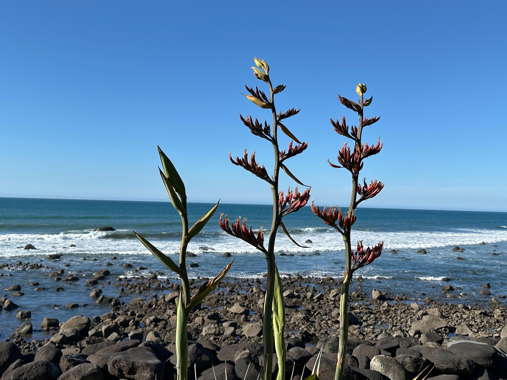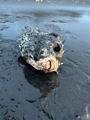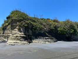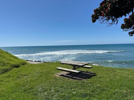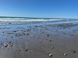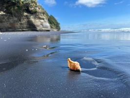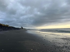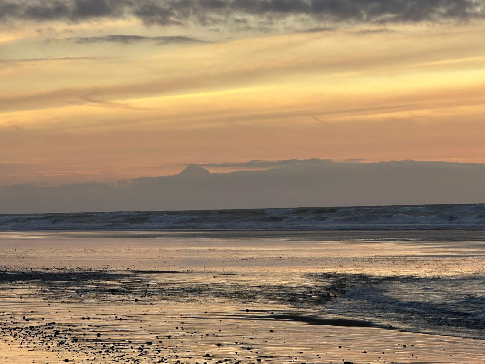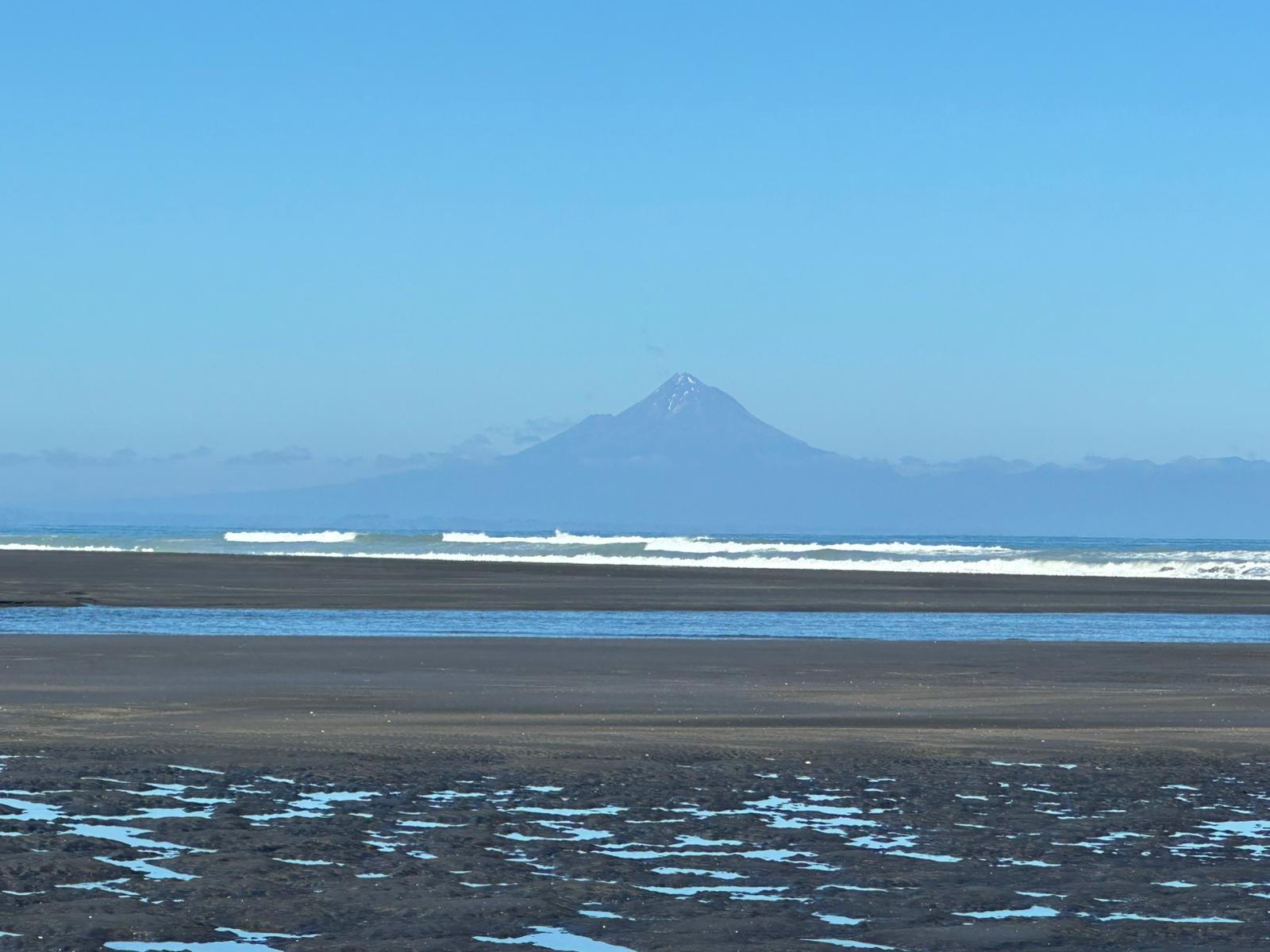 Das Erste, was ich nach dem Einchecken tat, war ein Spaziergang am Meer. Der Strand war so gut wie menschenleer, abgesehen von ein paar Anglern. Mit dem ersten Pärchen unterhielt ich mich; sie erzählten mir, dass der Fischfang zurzeit nicht sehr erfolgreich sei. Sie fingen kaum etwas, doch just in der Zeit, als ich mit ihr sprach, hatte er einen Knurrhahn an der Angel. Mensch, der Fisch hatte große Augen, die er kurze Zeit später aber für immer schloss. Er war ihr Abendessen – ein schöner Fisch mit seiner roten Farbe und den außergewöhnlichen Brustflossen. Ich lief noch ein Stück weiter und hatte Aussicht auf den Taranaki, allerdings sah ich nur den Gipfel, der Rest des Berges war in Wolken gehüllt.
