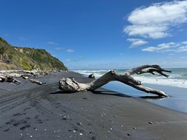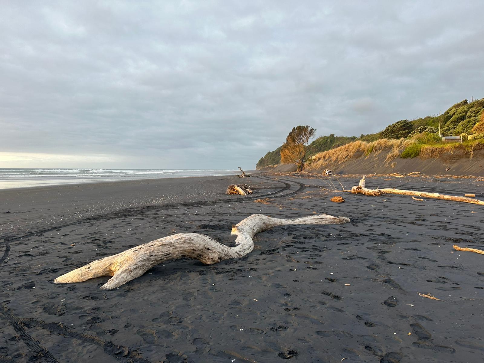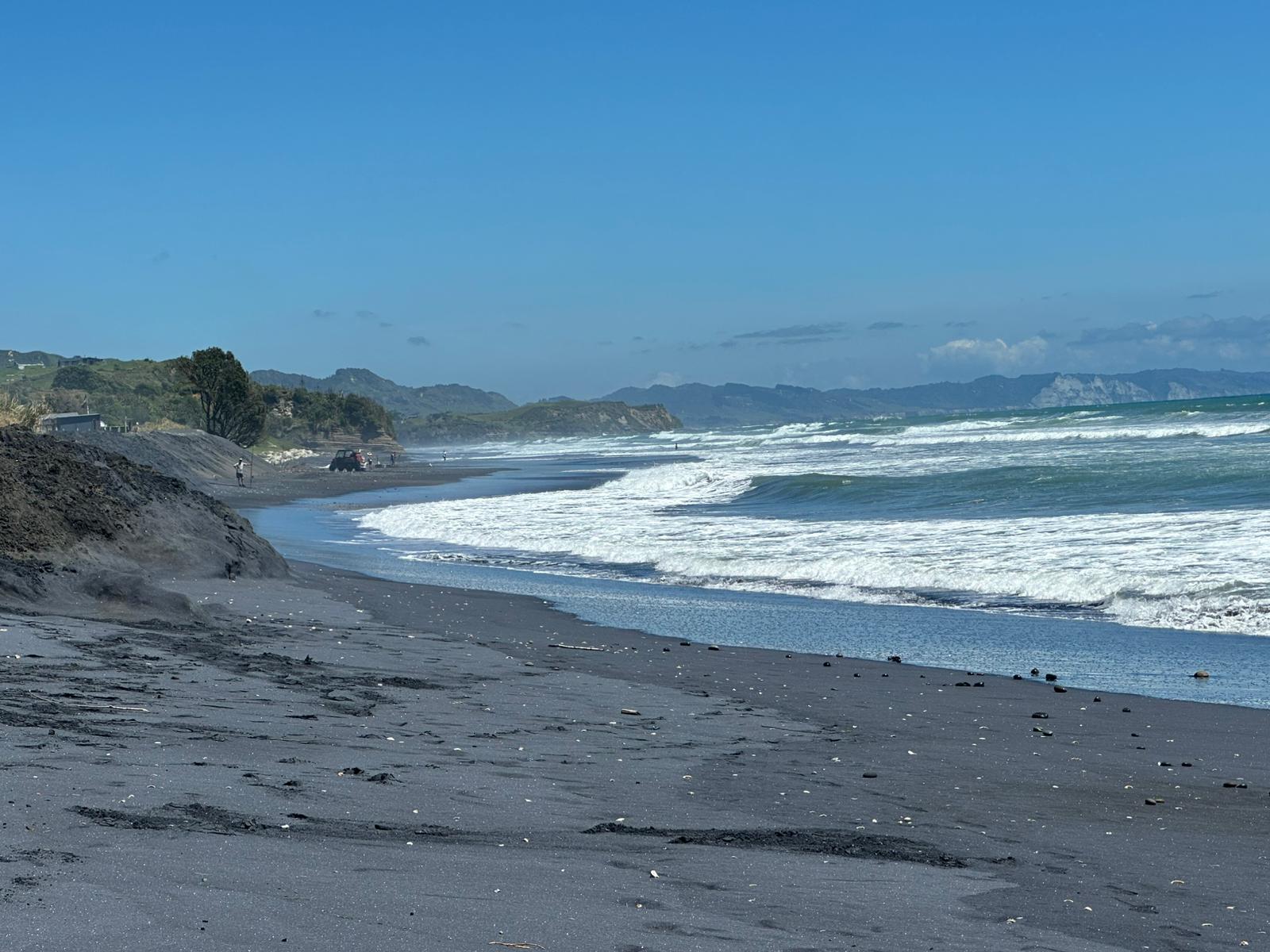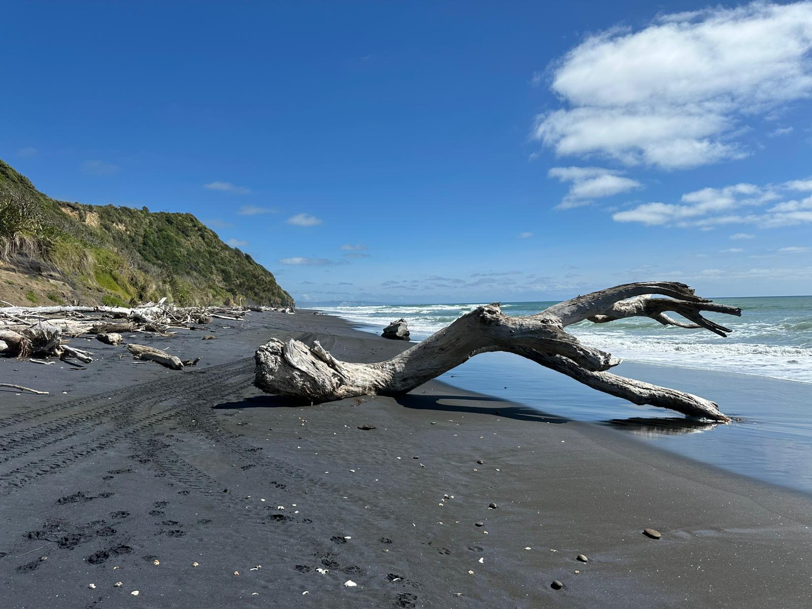 Auch dort, wo sie mich absetzte, musste ich nicht lange warten. Ein Auto fuhr zunächst an mir vorbei, kam aber noch einmal zurück. Lance nahm mich mit seinem kleinen Auto mit. Er räumte extra noch Bretter um, damit ich Platz hatte und schon ging es los. Er kommt aus dieser Region und erzählte mir viel über das Land und die Küste. Schon auf dem Hinweg hatte ich diese atemberaubenden Blicke auf die Strände und das Meer genossen, und heute wiederholte sich das. Das Highlight der Fahrt mit ihm war, dass er auf den Strand abbog und ein Stück über den schwarzen Strand fuhr – das hatte ich noch nie zuvor getan. Ich war so begeistert von diesem Strand, dass ich beschloss, in Mokau einfach mein Zelt aufzuschlagen.