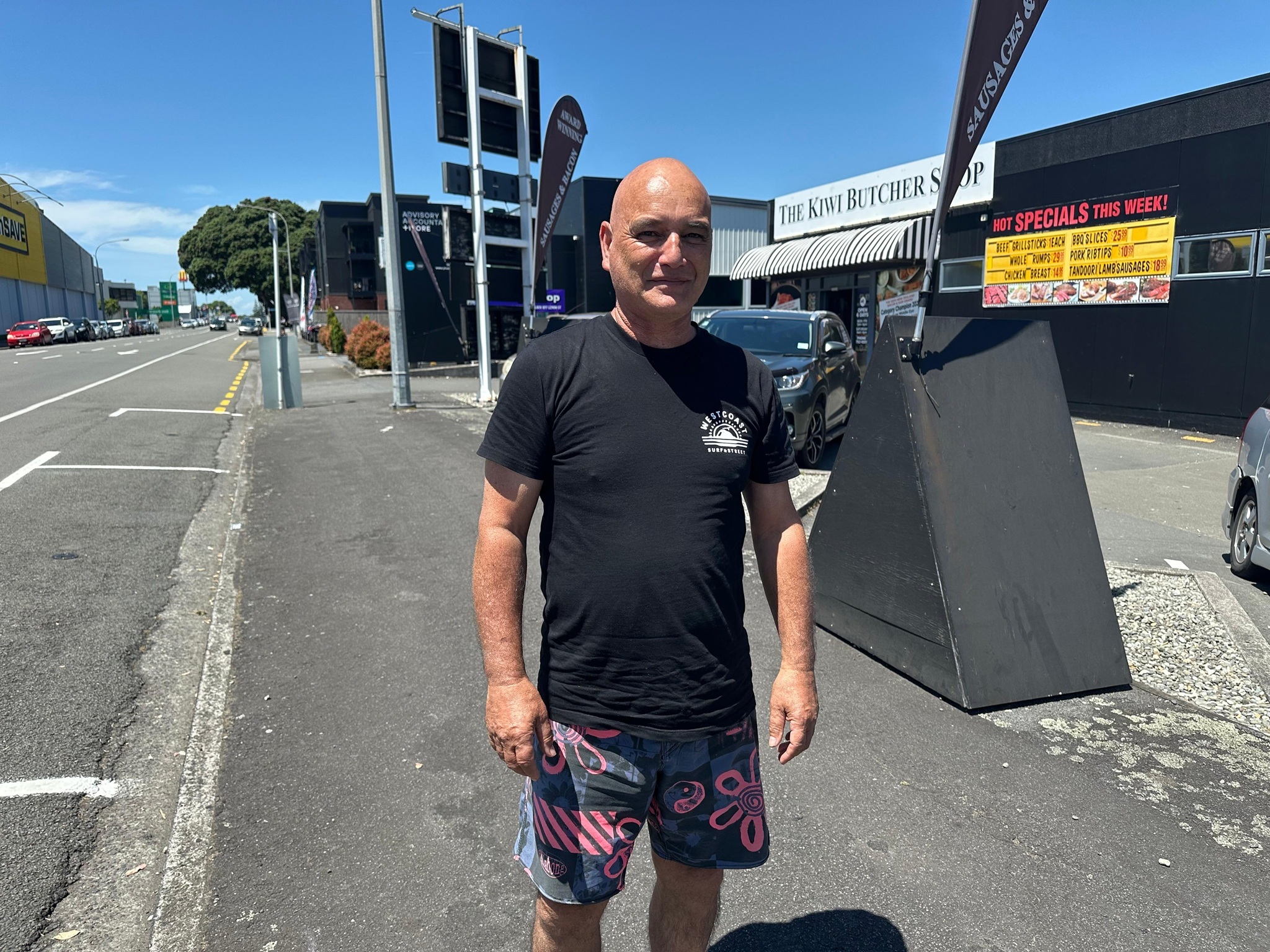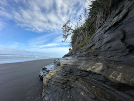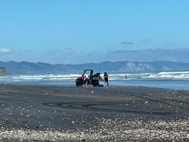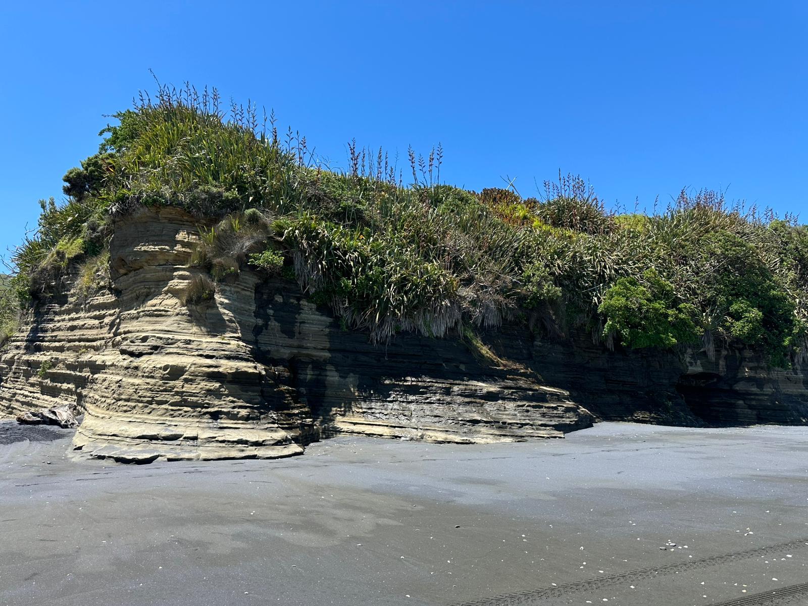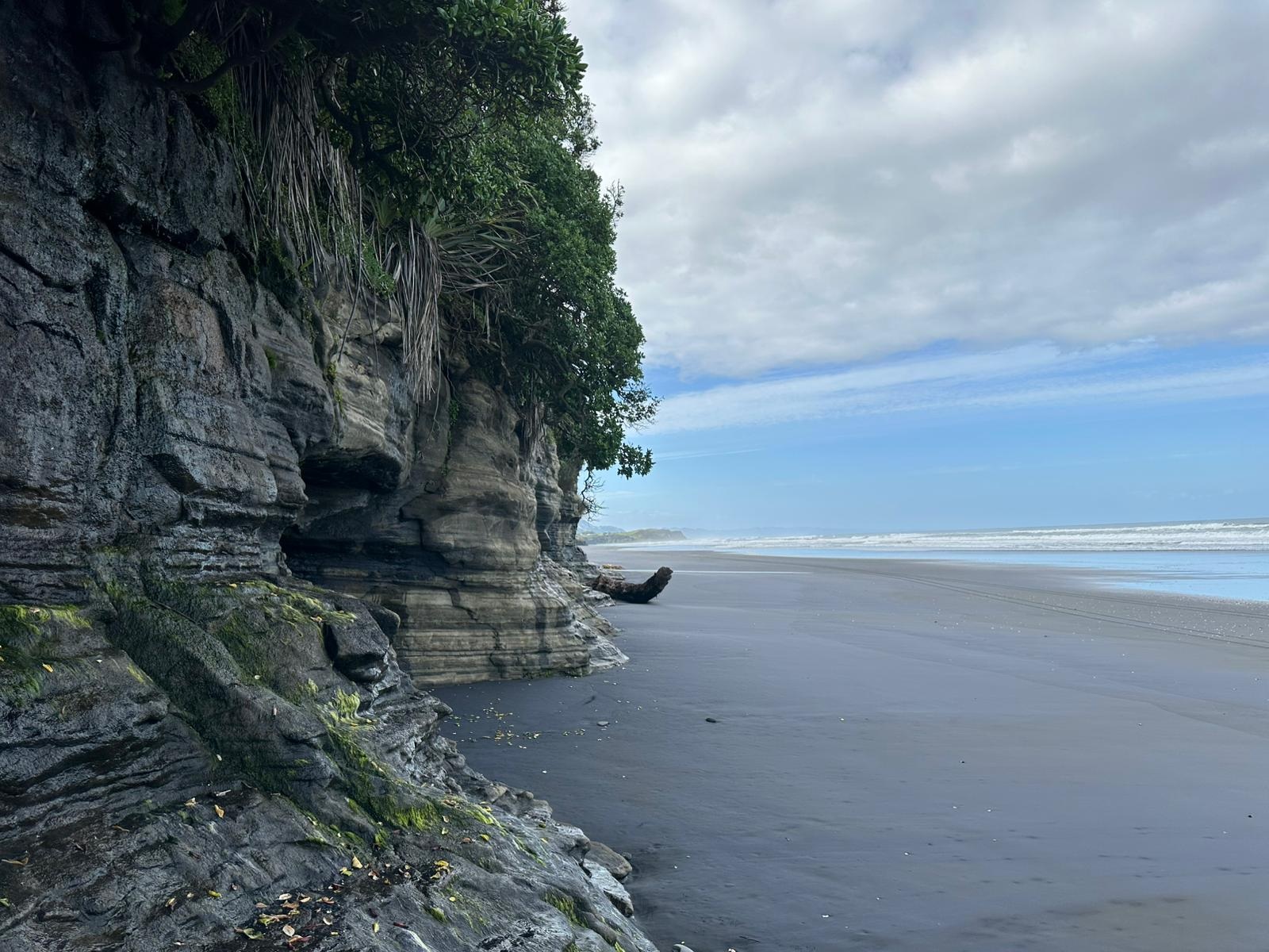 Auch dort, wo sie mich absetzte, musste ich nicht lange warten. Ein Auto fuhr zunächst an mir vorbei, kam aber noch einmal zurück. Lance nahm mich mit seinem kleinen Auto mit. Er räumte extra noch Bretter um, damit ich Platz hatte und schon ging es los. Er kommt aus dieser Region und erzählte mir viel über das Land und die Küste. Schon auf dem Hinweg hatte ich diese atemberaubenden Blicke auf die Strände und das Meer genossen, und heute wiederholte sich das. Das Highlight der Fahrt mit ihm war, dass er auf den Strand abbog und ein Stück über den schwarzen Strand fuhr – das hatte ich noch nie zuvor getan. Ich war so begeistert von diesem Strand, dass ich beschloss, in Mokau einfach mein Zelt aufzuschlagen.