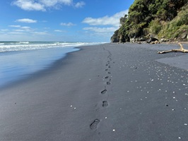 Es war eine ausgezeichnete Entscheidung gewesen, eine Nacht in Mokau zu verbringen. Ich hatte wunderbar geschlafen und konnte mich am Morgen ganz in Ruhe fertig machen. Nachdem ich alles zusammengepackt hatte, ging ich noch einmal hinunter zum Strand und spazierte ein wenig durch den schwarzen Sand, bevor ich mich zur Straße aufmachte. Ich unterhielt mich kurz mit Steve und seinem Hund, er wünschte mir viel Glück, und schon stand ich bereit. Das erste Auto hielt sofort, als ich den Daumen rausstreckte. Christie nahm mich mit bis zur Abzweigung auf den Highway vier, was klasse war.