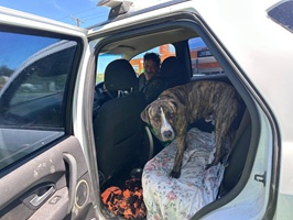 Ich stand gar nicht lange, da nahmen mich Rew und sein Hund Whisper mit. Das war richtig unterhaltsam. Er hatte in der Stadt eingekauft und war so durstig, dass er das erste Bier (hoffentlich das erste!) während der Fahrt trinken musste. Zehn Kilometer weiter stand ich wieder auf der Straße, diesmal glücklicherweise unter einem Baum im Schatten, was bei 24 Grad besser war als in der prallen Sonne.