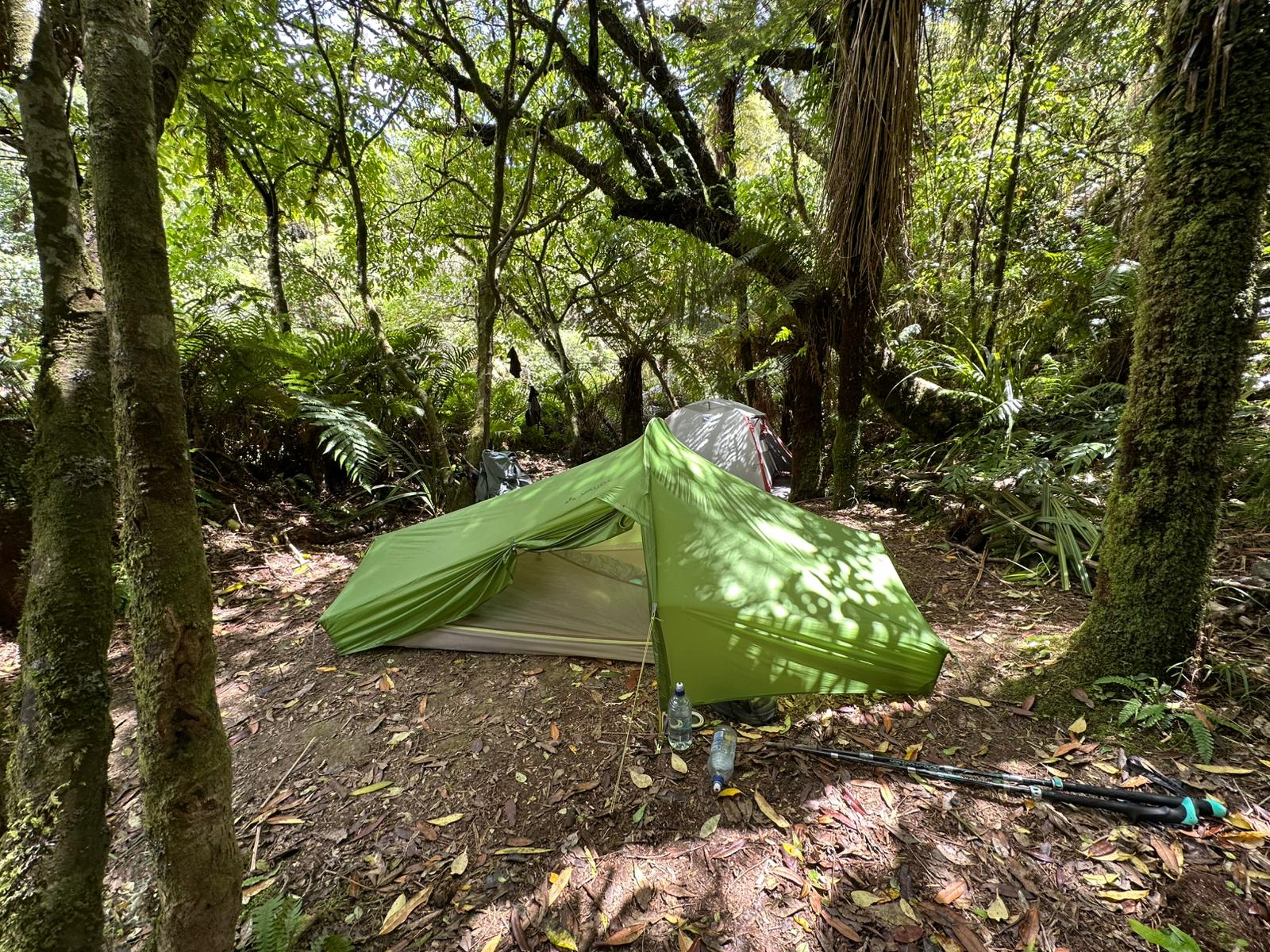 Die Gabelung kam und ich entschied mich für den Bypass. Die andere Strecke schien mir zu rutschig und ich vermutete, dass der Wald ohnehin überall recht ähnlich ist. Inzwischen war es nicht mehr weit bis zum Camp. Ich wünschte mir, die Sonne bliebe draußen, damit ich den Nachmittag zum Lesen und Ausruhen nutzen konnte.