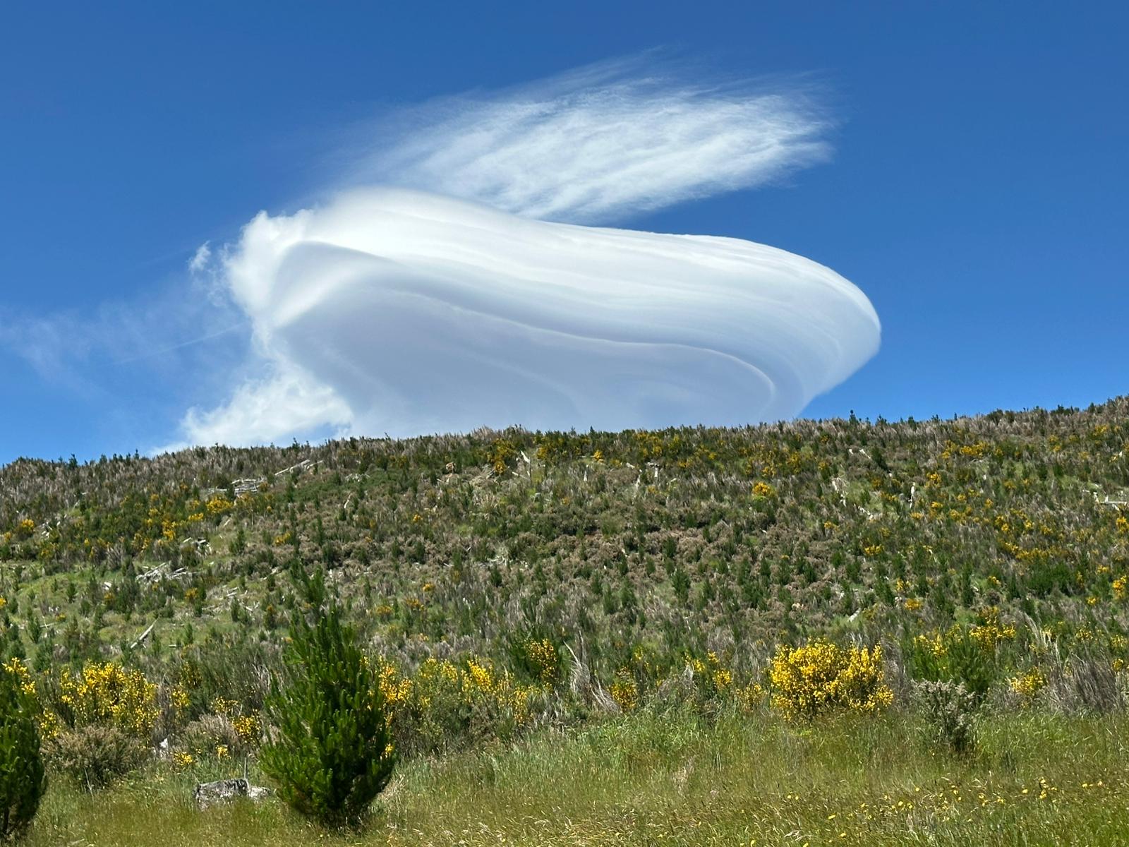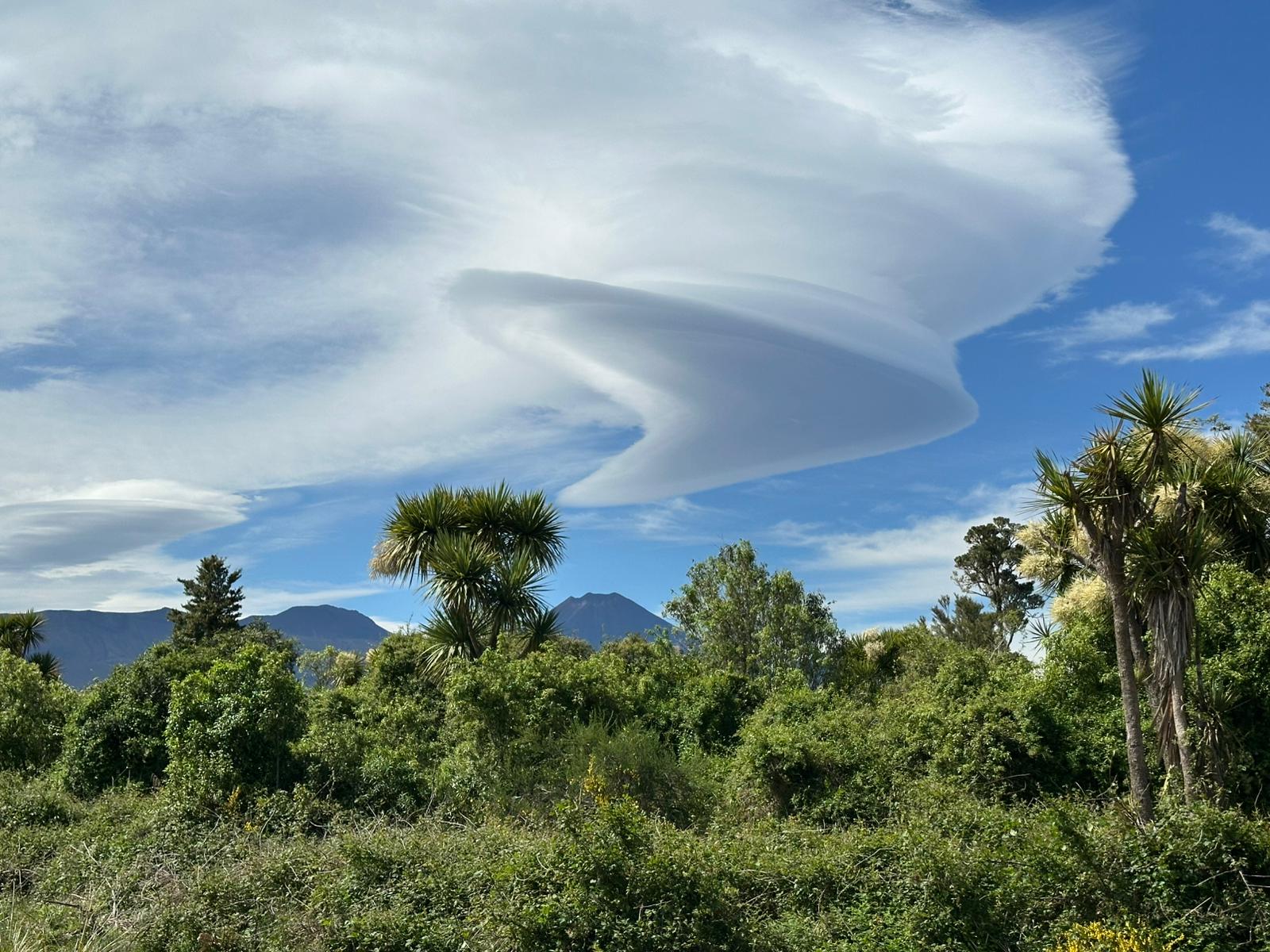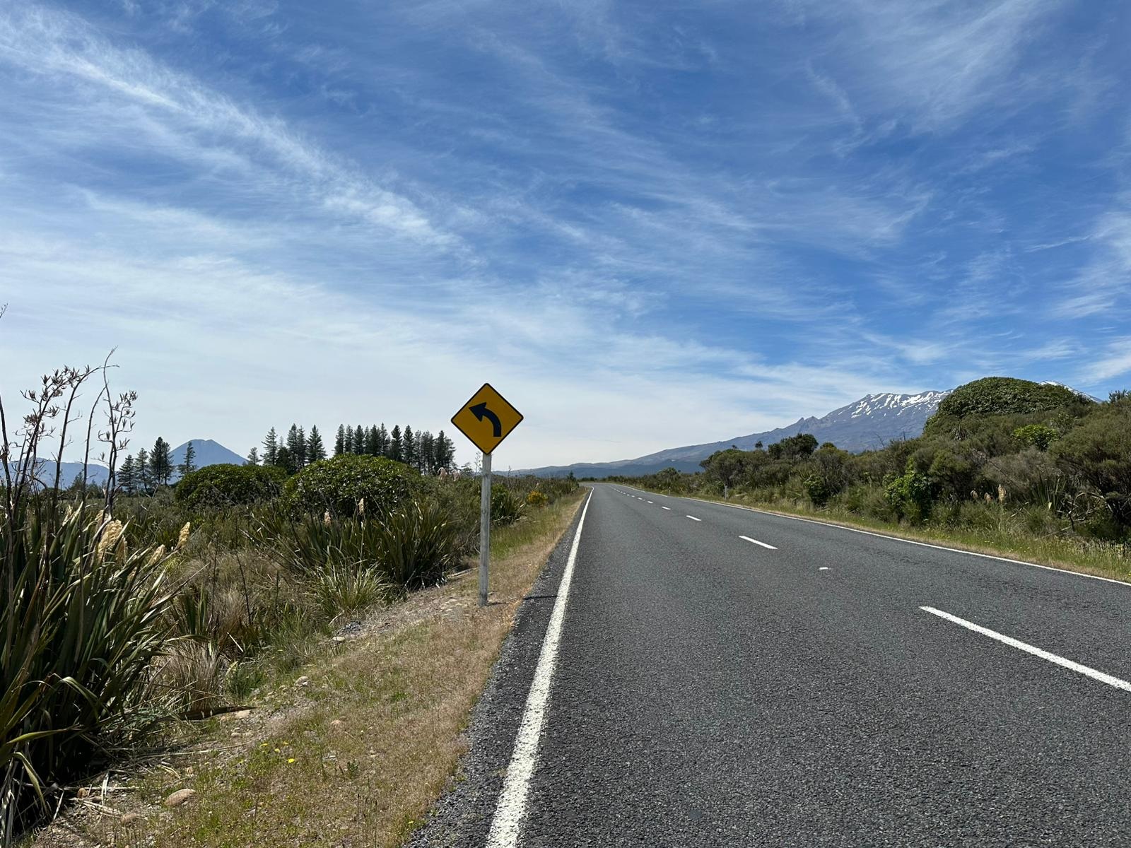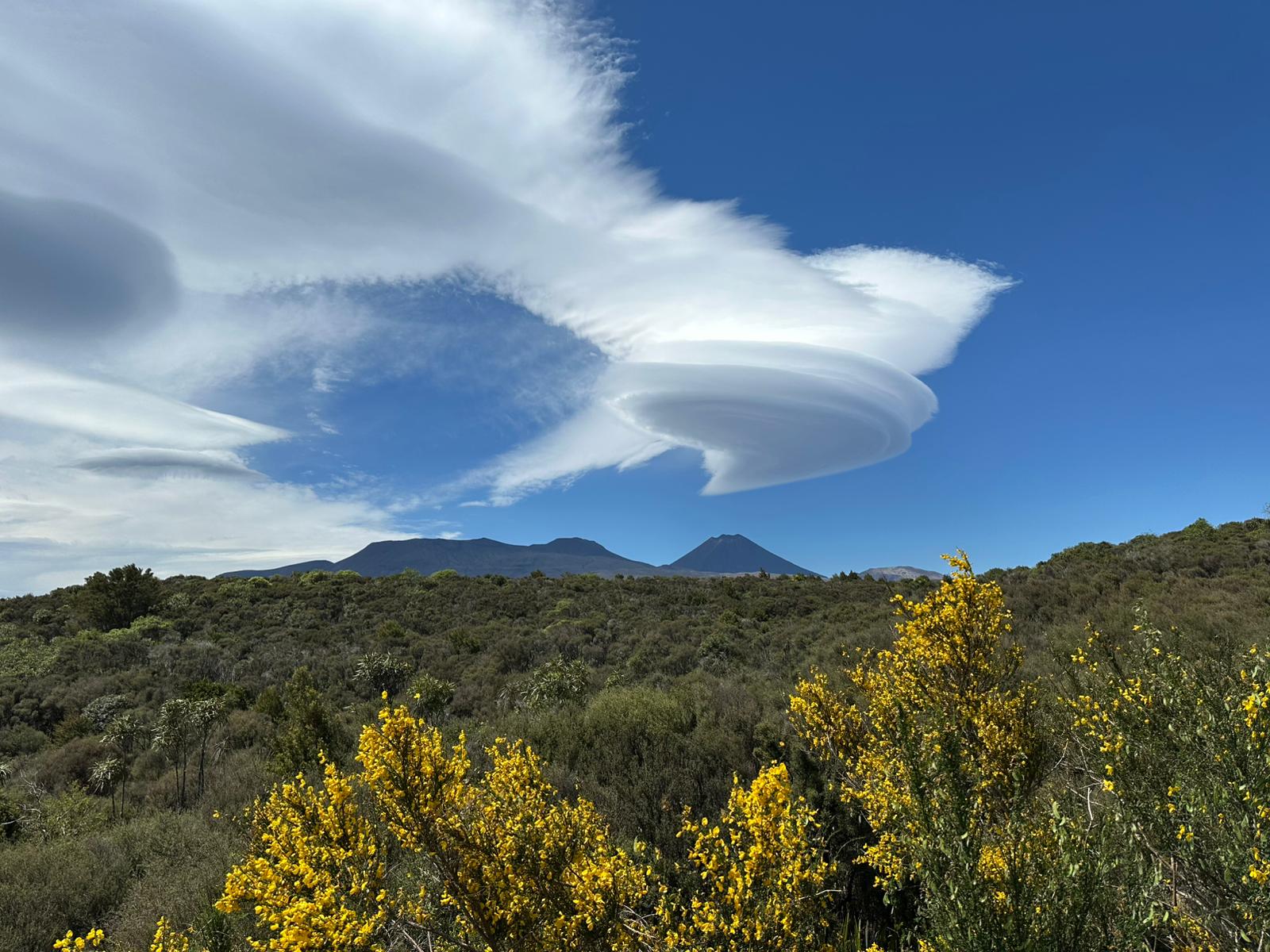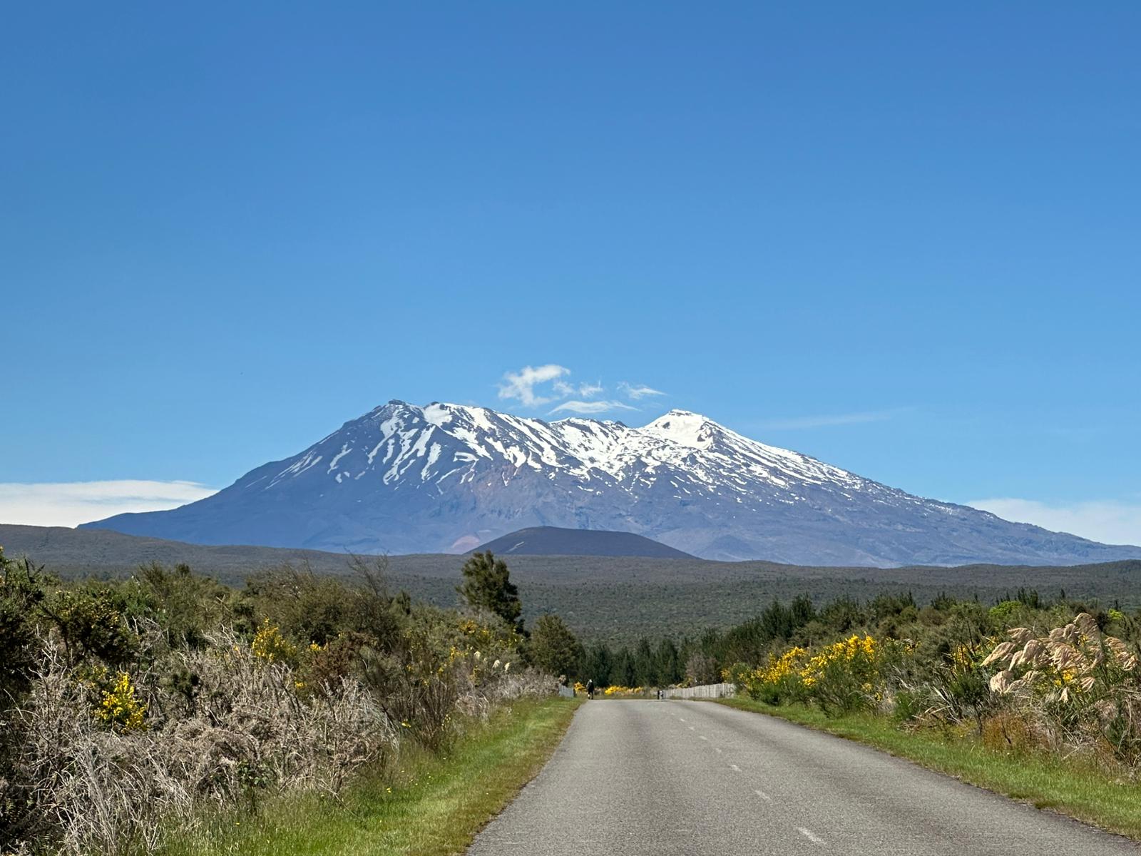 Als ich aus dem Wald heraustrat, bot sich mir ein fantastischer Ausblick: Ich sah direkt auf den Nationalpark und den schneebedeckten Mount Ruapehu. Die Kiefern, der gelb blühende Ginster und im Hintergrund die Vulkane – es war atemberaubend. Die geschichtete Wolke über dem Gipfel war das i-Tüpfelchen.