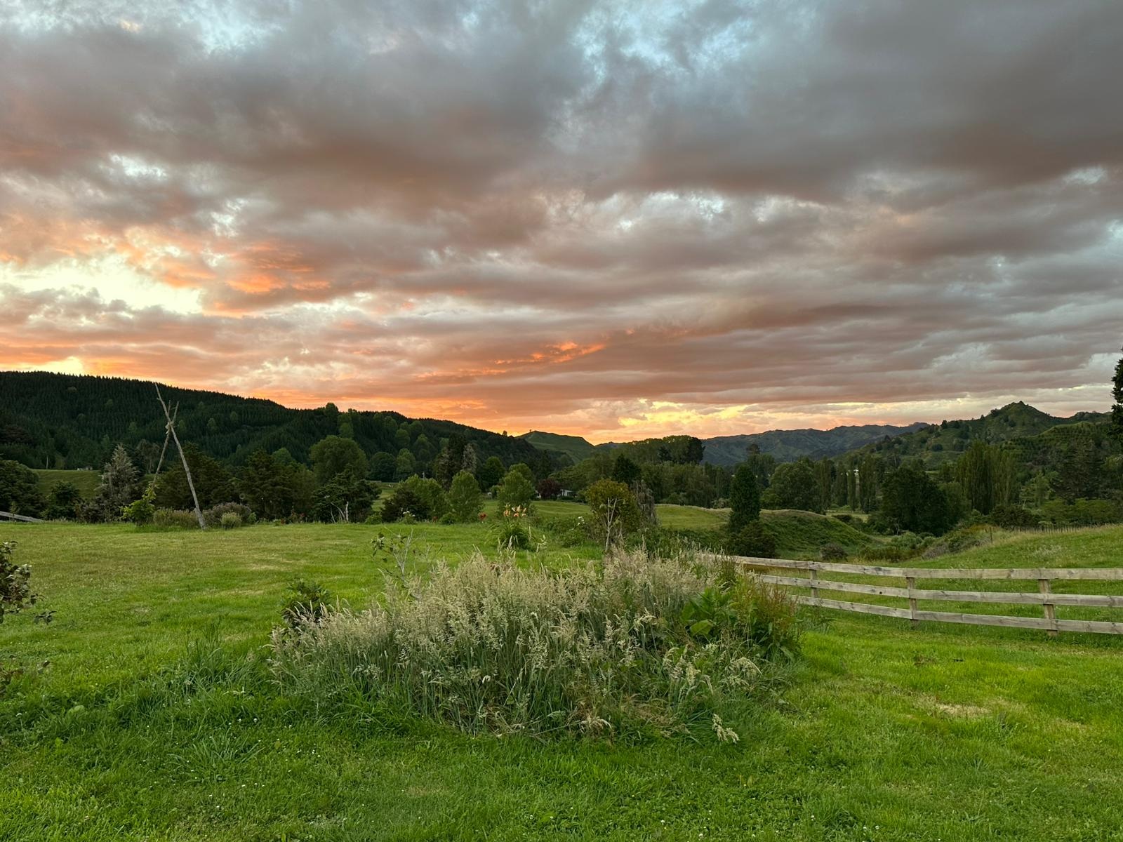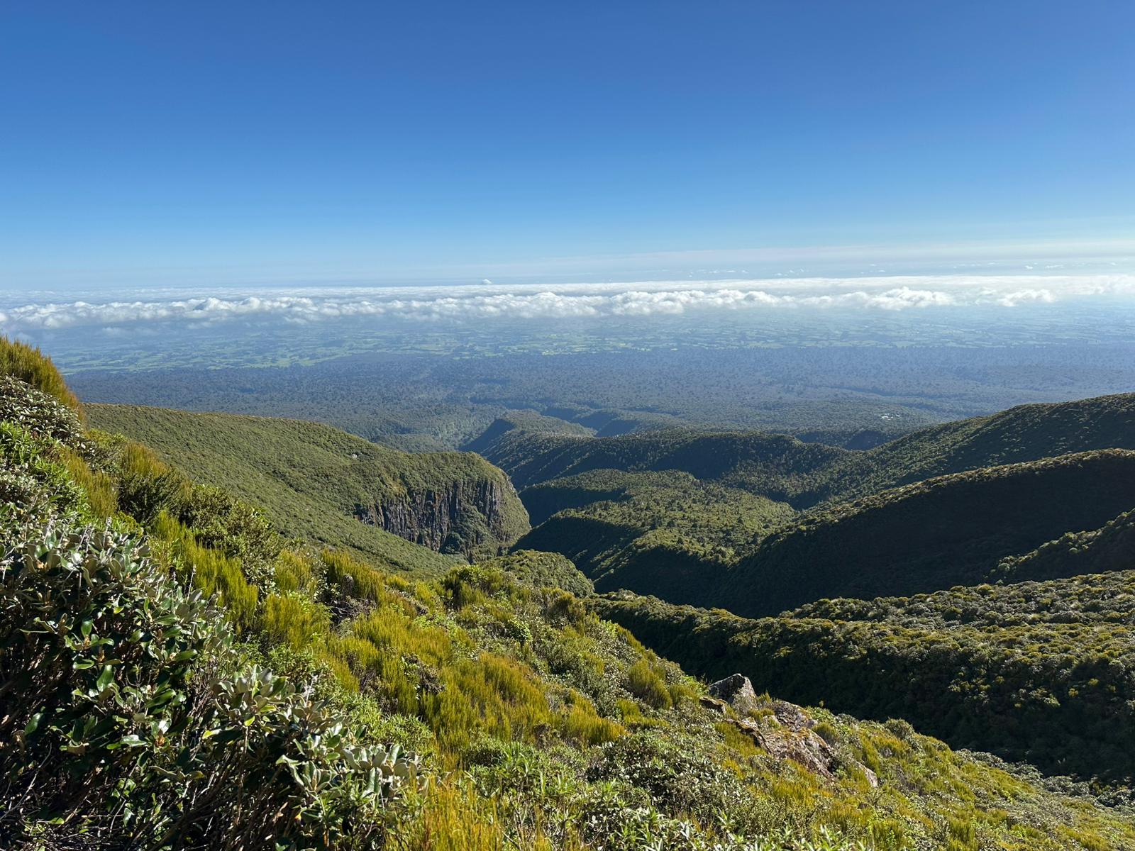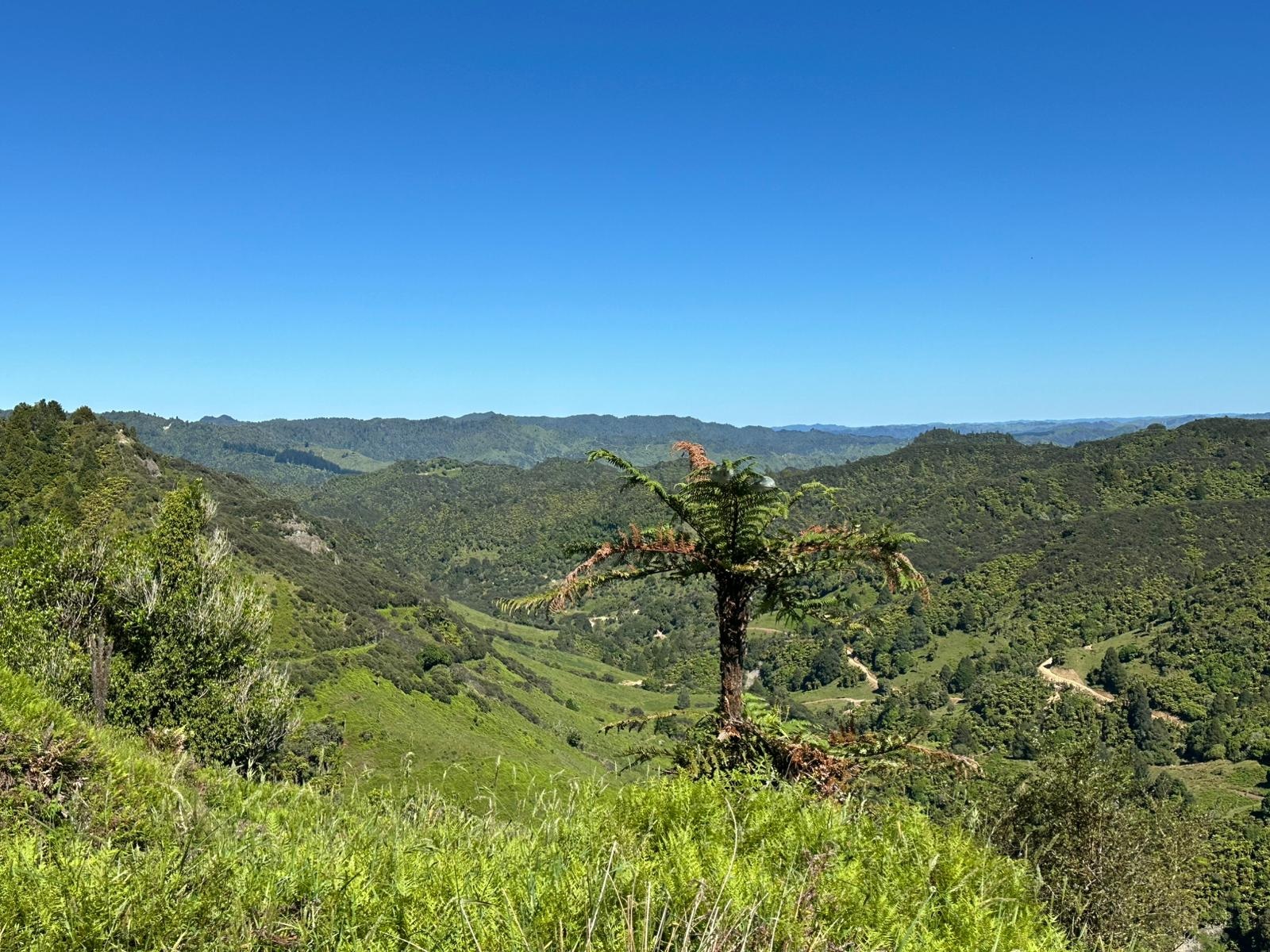 Doch dann erhaschte ich einen wunderbaren Blick ins Tal hinunter und sah sogar den Taranaki in der Ferne. Wenig später schlängelte sich ein Wiesenweg gemütlich nach unten mit herrlichen Blick ins Tal. Und dann hatte ich es geschafft: Ich knackte die 1.200 km Marke!