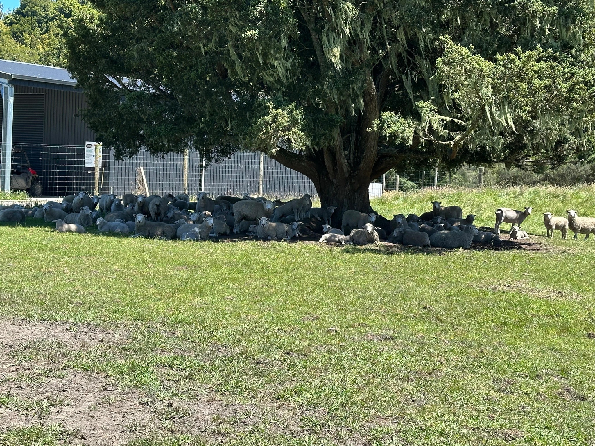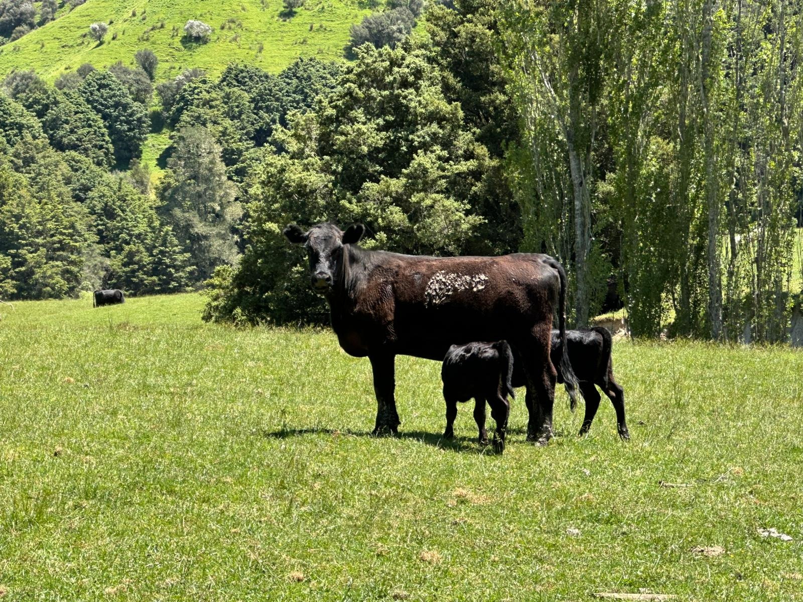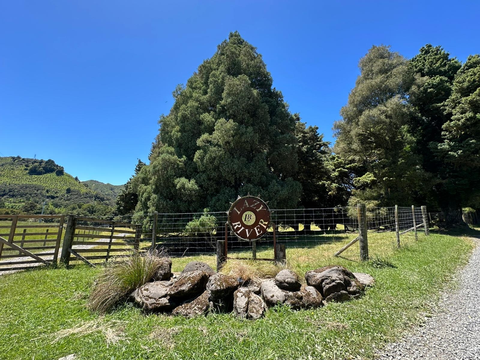 Das Straßenstück zog sich ganz schön und ich freute mich darauf, am Ziel meine heißen Füße im kühlen Fluss zu baden. Die tierische Wohngemeinschaft auf einer der Weiden erfreute mich bis dahin: Schafe, Kühe mit ihren Kälbern, Pukekos und Enten. Das hatte ich in dieser Kombination auch noch nicht gesehen.