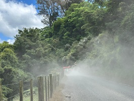 Am Morgen war die Temperatur noch angenehm, doch im Laufe des Tages wurde es ganz schön warm. Auf dem Schotterweg reduzierten die Autos kaum ihre Geschwindigkeit, weshalb ich ständig in einer Staubwolke stand. Das passierte leider recht häufig.
