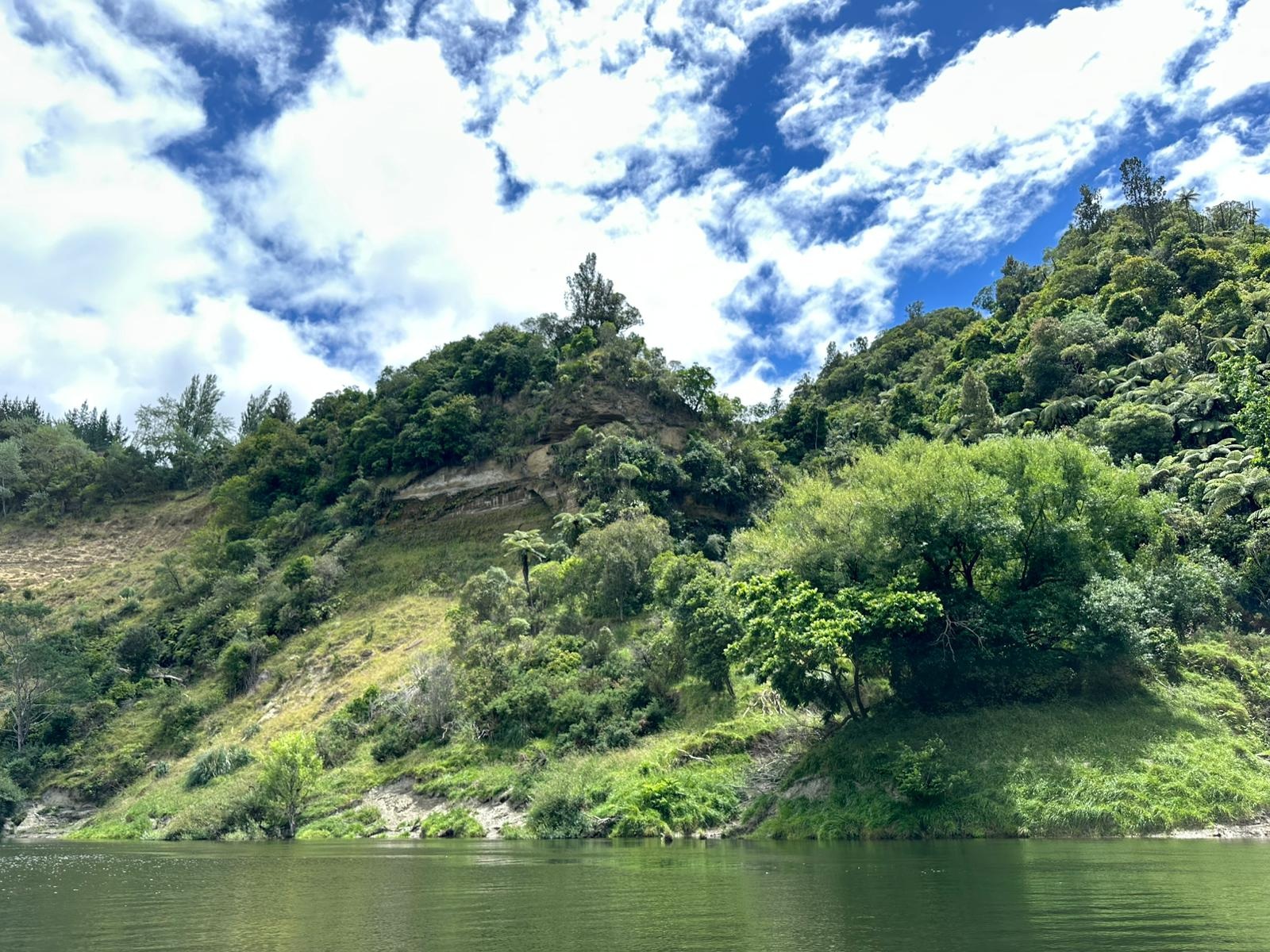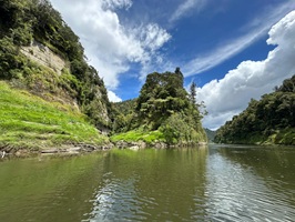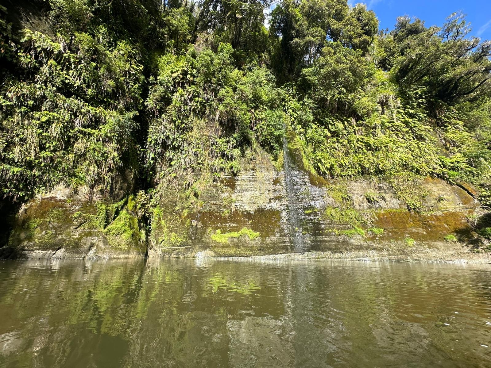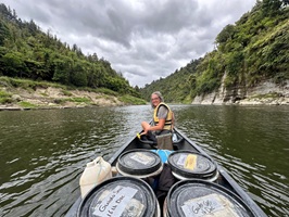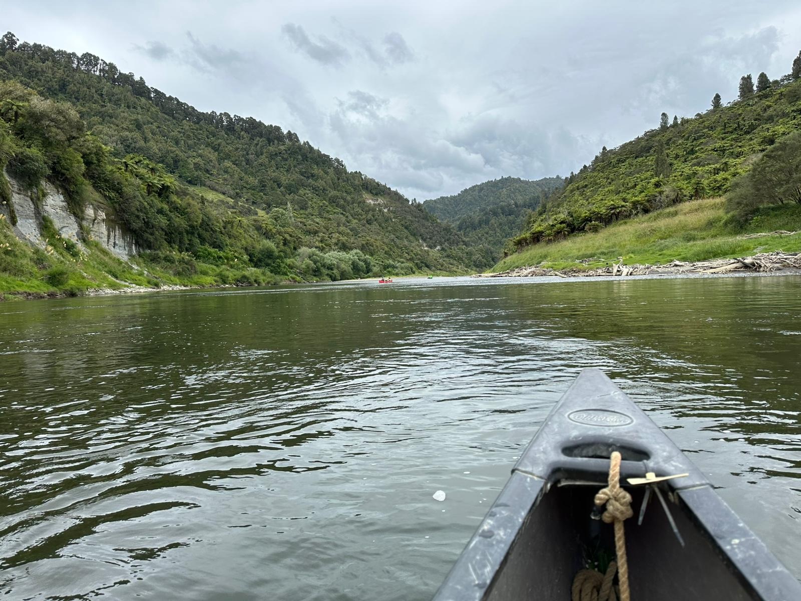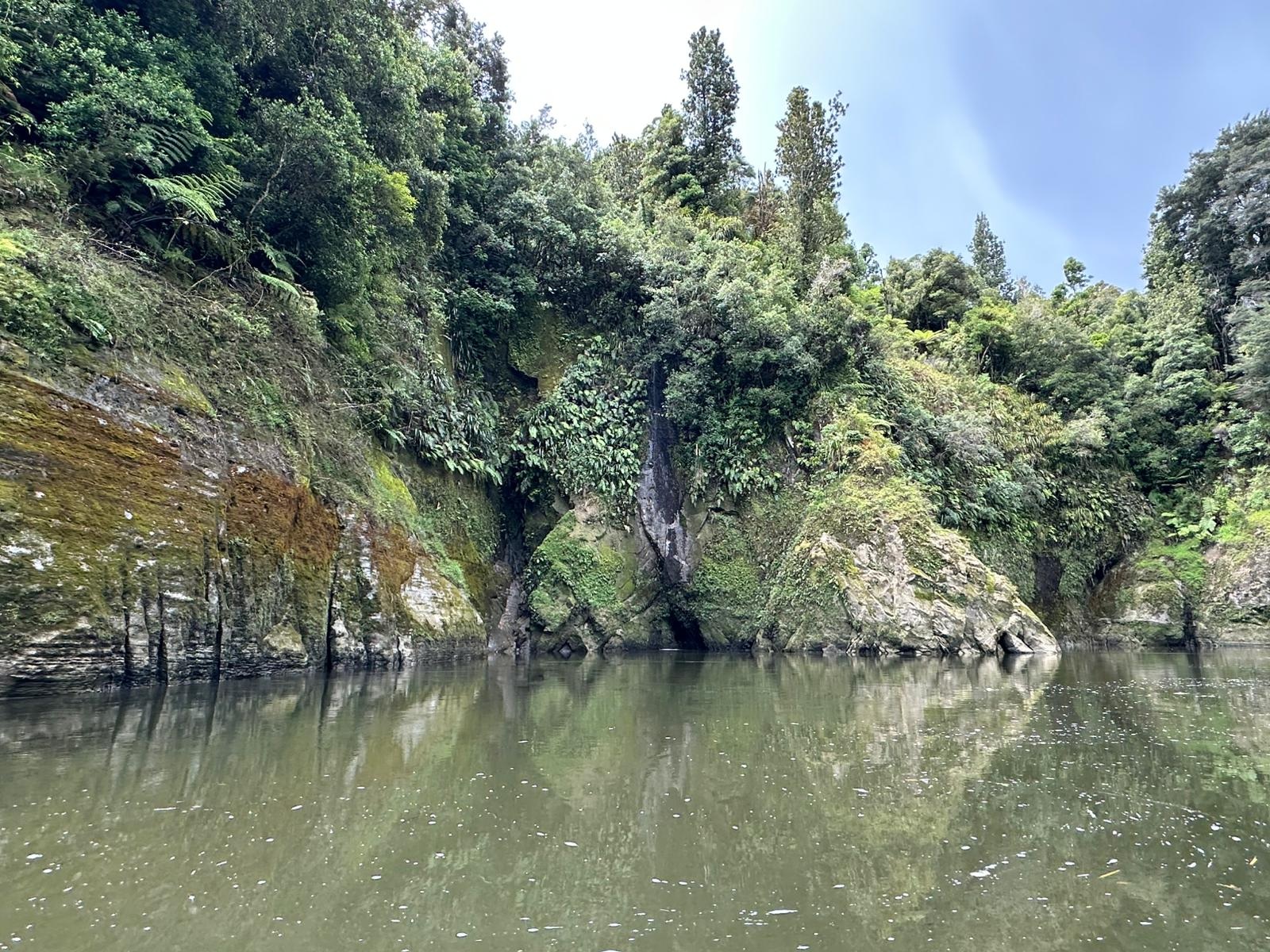 Die Fahrt gestaltete sich von Beginn an als ein freudiges Abenteuer, bei dem Guido das Kanu als geschickter Kapitän sicher durch die ersten schnellen Passagen steuerte. Selbst als wir uns einmal drehten und eine Stromschnelle rückwärts durchfuhren, behielten wir die Oberhand und blieben trocken. Die Umgebung, durch die wir geglitten sind, wirkt wie aus einer anderen Welt. Geologisch ist der Whanganui River tief in weiches Sedimentgestein, den sogenannten Mudstone oder „Papa“, eingeschnitten, was die Entstehung der beeindruckenden, steilen Felswände ermöglichte. Diese Wände waren über und über mit Moos, Farnen und majestätischen Farnbäumen bewachsen, während zahllose Wasserfälle in die Tiefe stürzten. In dieser abgeschiedenen Wildnis, die vor allem durch dichten Regenwald geprägt ist, konnten wir etliche Ziegen beobachten, die sich an den steilen Hängen tummelten. Besonders die Vogelwelt ist hier einzigartig, wobei der Fluss oft vom Ruf des Tui oder des neuseeländischen Fächerschwanzes widerhallt.