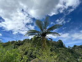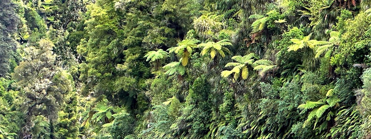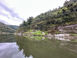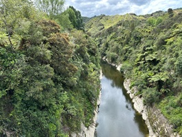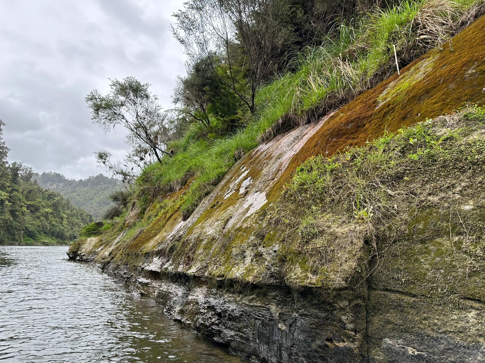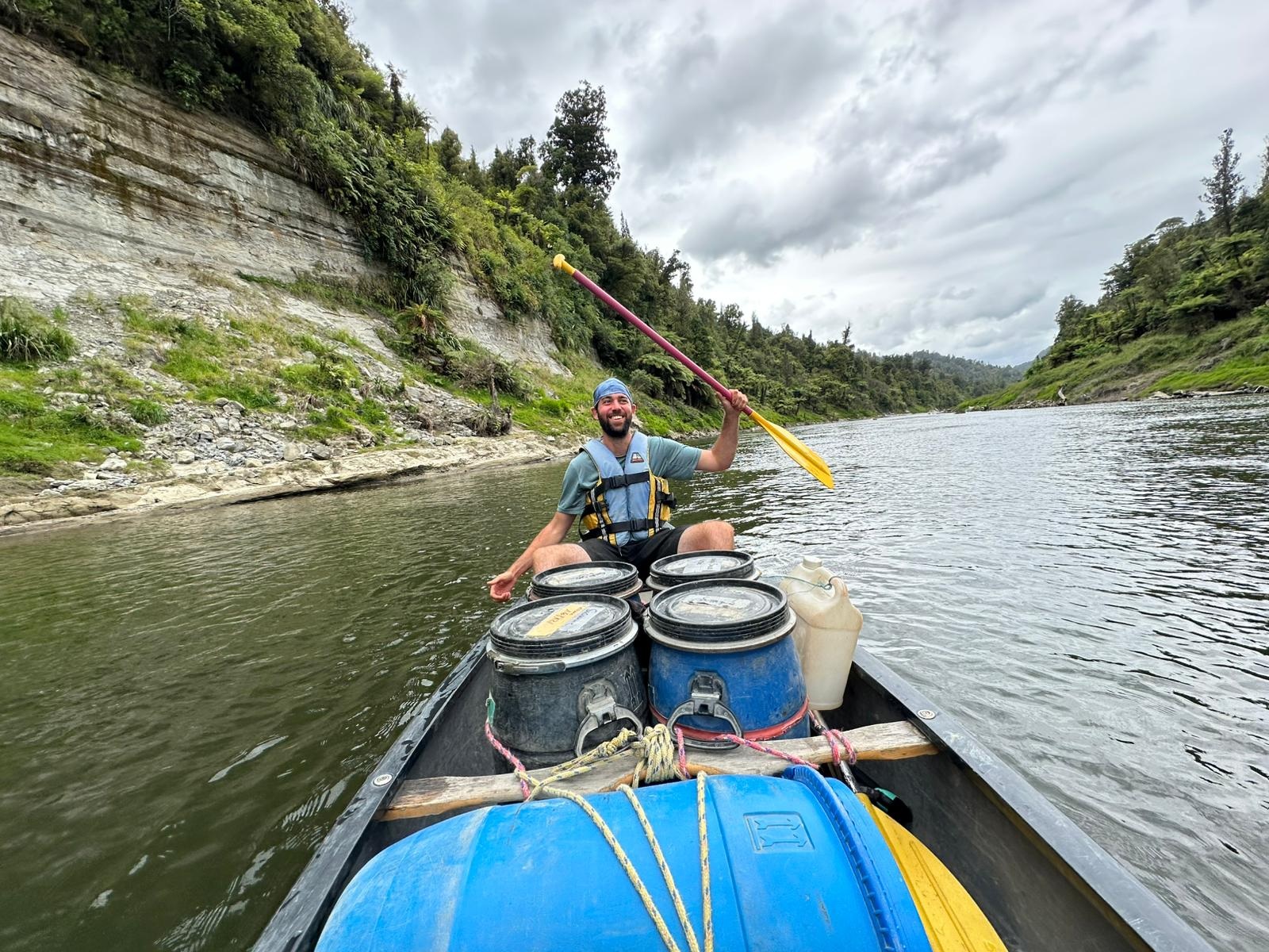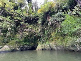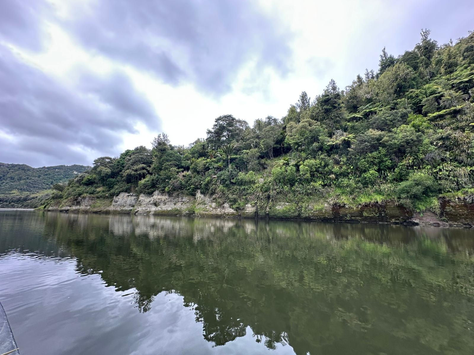 Die Fahrt gestaltete sich von Beginn an als ein freudiges Abenteuer, bei dem Guido das Kanu als geschickter Kapitän sicher durch die ersten schnellen Passagen steuerte. Selbst als wir uns einmal drehten und eine Stromschnelle rückwärts durchfuhren, behielten wir die Oberhand und blieben trocken. Die Umgebung, durch die wir geglitten sind, wirkt wie aus einer anderen Welt. Geologisch ist der Whanganui River tief in weiches Sedimentgestein, den sogenannten Mudstone oder „Papa“, eingeschnitten, was die Entstehung der beeindruckenden, steilen Felswände ermöglichte. Diese Wände waren über und über mit Moos, Farnen und majestätischen Farnbäumen bewachsen, während zahllose Wasserfälle in die Tiefe stürzten. In dieser abgeschiedenen Wildnis, die vor allem durch dichten Regenwald geprägt ist, konnten wir etliche Ziegen beobachten, die sich an den steilen Hängen tummelten. Besonders die Vogelwelt ist hier einzigartig, wobei der Fluss oft vom Ruf des Tui oder des neuseeländischen Fächerschwanzes widerhallt.