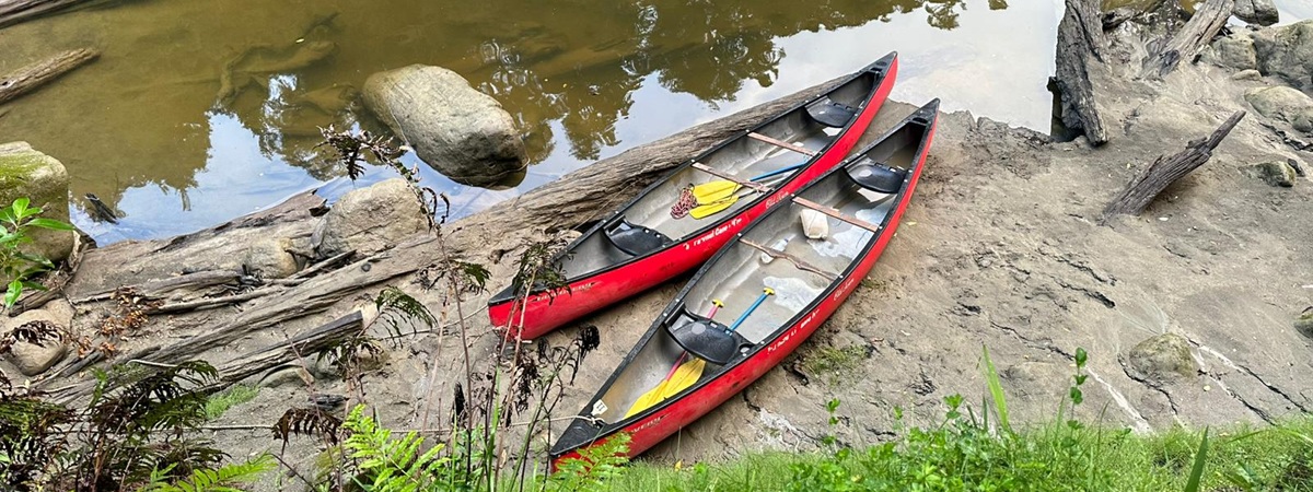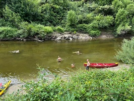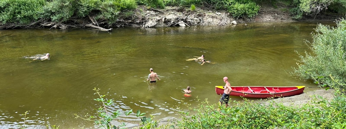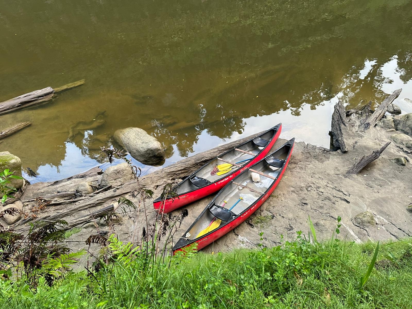 Nachdem wir unsere Rettungswesten angelegt und die ersten Probierrunden auf dem Wasser gedreht hatten, schickte uns Jonathan vom Kanuverleih schließlich auf den Fluss. Da der Wasserstand recht niedrig war, hieß es aufgepasst und sorgfältig navigieren, um Hindernissen wie Felsen und umgestürzten Bäumen auszuweichen.