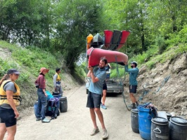 Anschließend begann der morgendliche Trott aus Packen und Vorbereiten. Ich lief geschäftig hin und her, hängte mein Zelt zum Trocknen auf die Leine und stellte pünktlich um 8.00 Uhr meine Fässer zur Abholung bereit. Da Guido noch eine Weile brauchte und ich nicht warten wollte, bis er mit Junior und dem Quad zum Abladen nachkam, fuhr ich kurzerhand selbst mit hinunter zum Fluss, um beim Verladen zu helfen. Es dauerte schließlich bis 9.30 Uhr, bis alles sicher verstaut und verschnürt war und wir endlich ablegen konnten.