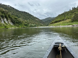 Nachdem ich meine Fässer gepackt hatte, wartete ich ungeduldig auf den Start und trug meine Ausrüstung schon einmal hinunter zum Fluss. Ich hoffte inständig auf Rückenwind für die bevorstehenden 19 Kilometer, da der Veranstalter eine Zeit von dreieinhalb Stunden veranschlagt hatte. Der Vormittag zog sich quälend in die Länge, und ich war sichtlich erleichtert, als wir um 11:15 Uhr endlich in den Kanus saßen. Die Stimmung auf dem Wasser war jedoch angespannt. Guido paddelte sehr gemächlich vor sich hin, was mich ziemlich verärgerte. Ich versuchte zwar, mich nicht in meine Wut hineinzusteigern, aber die Landschaft veränderte sich zusehends: Die Felsen wurden flacher, wichen einfachen Hügeln und zu allem Überfluss drehte der Wind, sodass er uns nun direkt von vorne entgegenwehte.