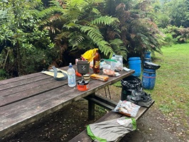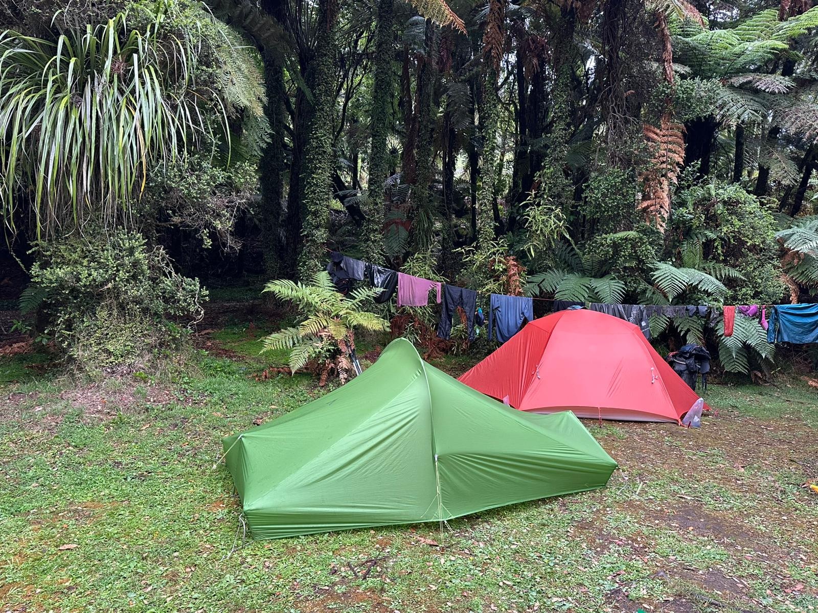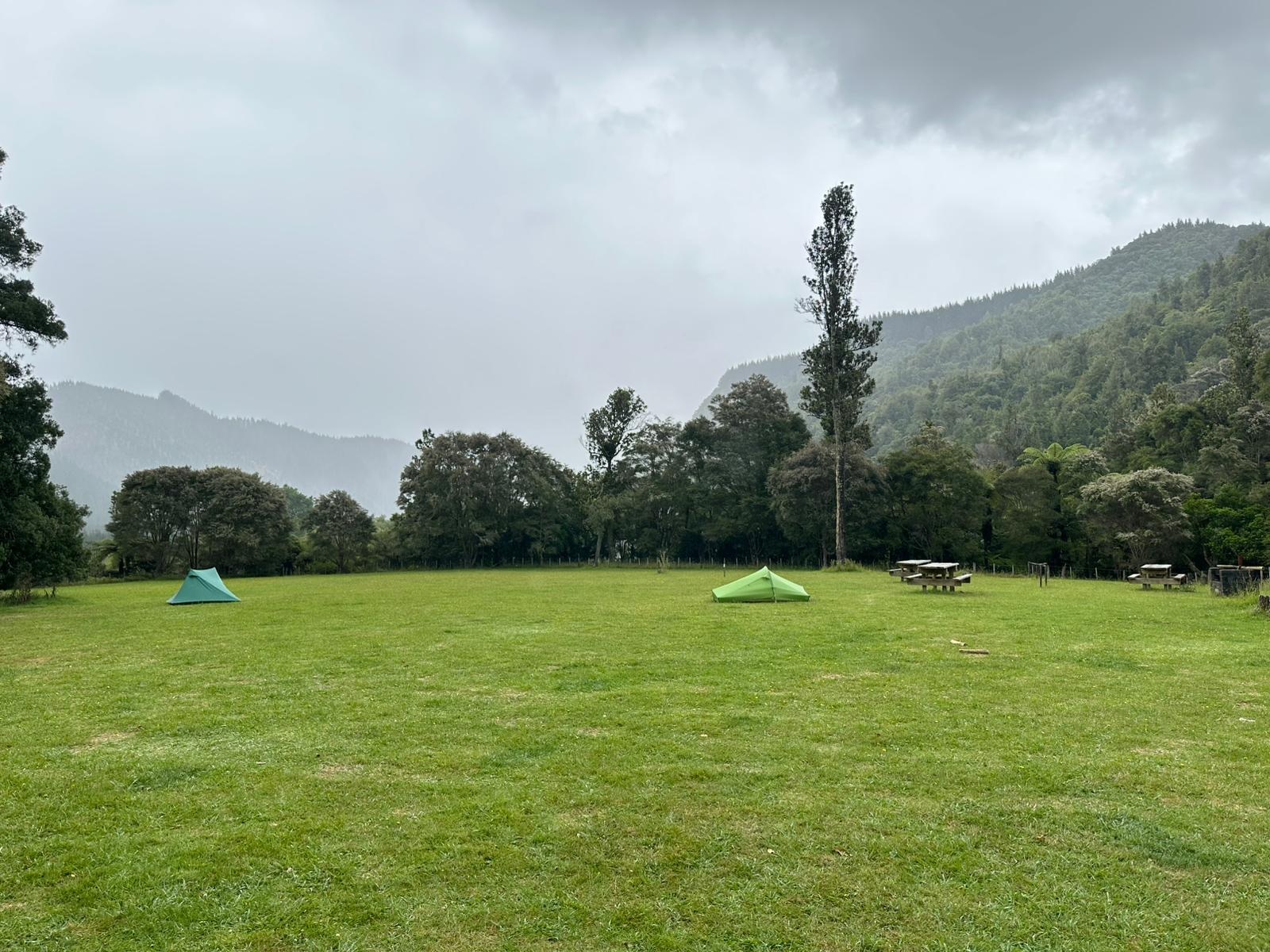 Nachdem wir am Hiponga Park angekommen waren, machten wir das Kanu fest und luden es aus. Die anschließende Schlepperei den Hang hinauf war zwar anstrengend, fiel mir aber deutlich leichter als am Vortag. Der Zeltplatz bot eine riesige Rasenfläche für bestimmt 50 Zelte mit Grillstellen, Picknicktischen und einer offenen Hütte. Zunächst nutzte ich die Sonne, um mein Zelt zu trocknen, doch kaum stand es, setzte der Regen ein, der den gesamten Nachmittag und Abend anhielt.