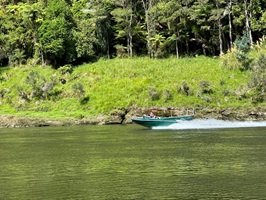 Auf dem Wasser begegneten uns heute auch einige Jetboote, die jedoch rücksichtsvoll das Tempo drosselten, um uns nicht mit ihren Wellen in Bedrängnis zu bringen. Die Spannung stieg, als wir uns den berüchtigten „50/50 Rapids“ näherten, doch wir meisterten alle Stromschnellen, ohne zu kentern, auch wenn ich im vorderen Teil des Kanus wieder ordentlich Spritzwasser abbekam. In Pipiriki angekommen, hatten wir das große Glück, dass unser Gepäck trotz der späten Stunde (nach 18 Uhr) noch abgeholt wurde, was mir den mühsamen Transport zum 600 Meter entfernten Campingplatz ersparte.
