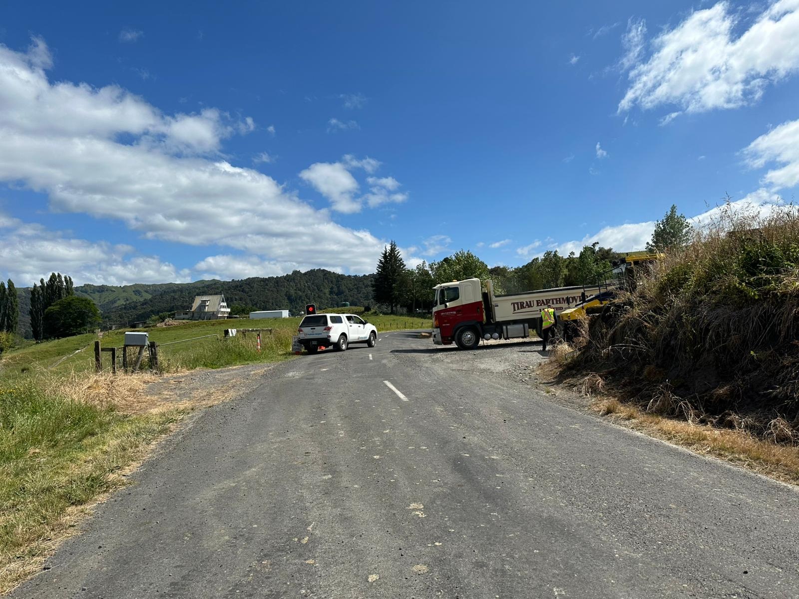An einer Stelle wurde gerade der Straßenbelag erneuert. Die freundlichen Arbeiter fuhren mich das kurze Stück im Auto mit, da ich dort nicht laufen durfte. Sie boten mir noch Wasser an, aber ich hatte genug und so ging es bald zu Fuß weiter. Den ganzen Tag über wurde ich vom Retaruke River begleitet. Es gab immer wieder schöne Ausblicke auf den Fluss. Es war heute ein ganz gemütlicher Wandertag. Merk-würdig war eine Rasenfläche am Weg,die aussah wie ein perfekt gepflegter Golfplatz, allerdings weideten dort nur Schafe und Pukekos statt Golfern.