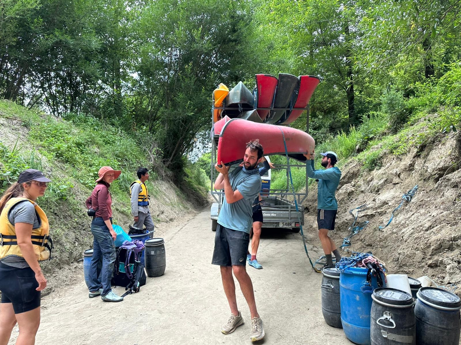 Der heutige Morgen begann glücklicherweise mit Sonnenschein, auch wenn der Gedanke an meine klatschnassen Shorts, in die ich für den Start schlüpfen musste, schon jetzt Überwindung kostete. Nach dem Frühstück schleppte ich meine beiden Fässer wieder hinunter zum Ufer, um sie im Boot zu verstauen. Wieder nahm sich Guido viel Zeit für die Sicherung der Fässer, bevor wir uns erneut in die Strömung begaben.